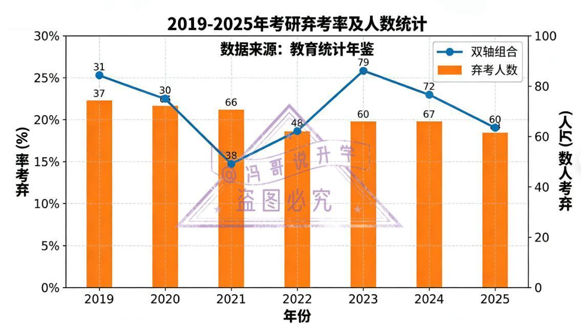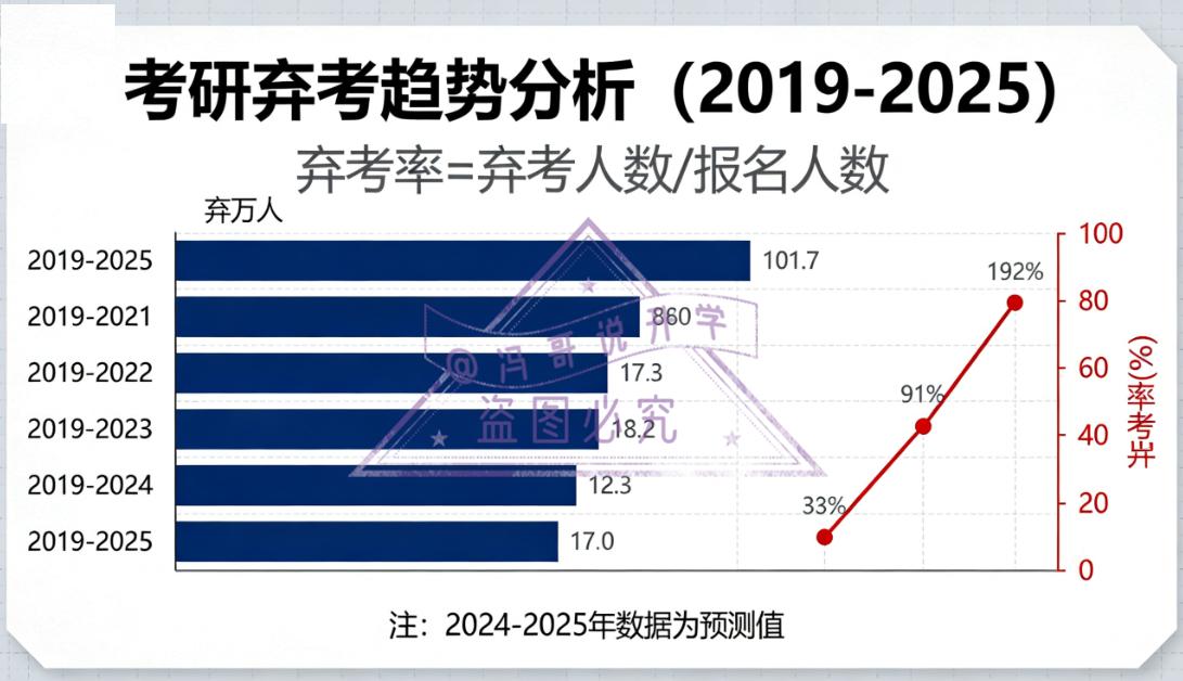 最近刷到 2025 考研弃考率约 20% 的消息,每 5 个报名的人里就有 1 个会放弃… 其实弃考高峰早有规律:7-8 月、11 月、考前一个月、甚至考试当天! 有没有宝子现在正处于 “想放弃” 的阶段?😭 其实挺过这些关卡的你,已经打败了大部分对手!记得那句话吗?“坚持考完 = 打赢几十万人”! 可能是今年最后一场考研弃考潮…… 我们先来看研究生考试往年的弃考率,压压惊: ✍🏻2025年,弃考率约20%; ✍🏻2024年,弃考率约20%-25%; ✍🏻2023年,弃考率高达35%; ✍🏻2022年,有46万多人弃考,弃考率为11.19%; ✍🏻2021年,有42万多人弃考,弃考率为11.14%; ✍🏻2020年,有34万多人弃考,弃考率为9.97%; ✍🏻2019年,有37万多人弃考。弃考率为12.76%。 弃考高峰主要集中在以下时间段: 🔺弃考第一高峰期:7-8月份 🔺弃考第二高峰期:11月份 🔺弃考第三高峰期:考前一个月 🔺弃考第四高峰期:考试期间 你现在卡在哪个阶段?有没有想放弃的瞬间?评论区留言,我们互相打气! 2025 考研 考研加油 拒绝弃考 坚持就是胜利 考研经验分享