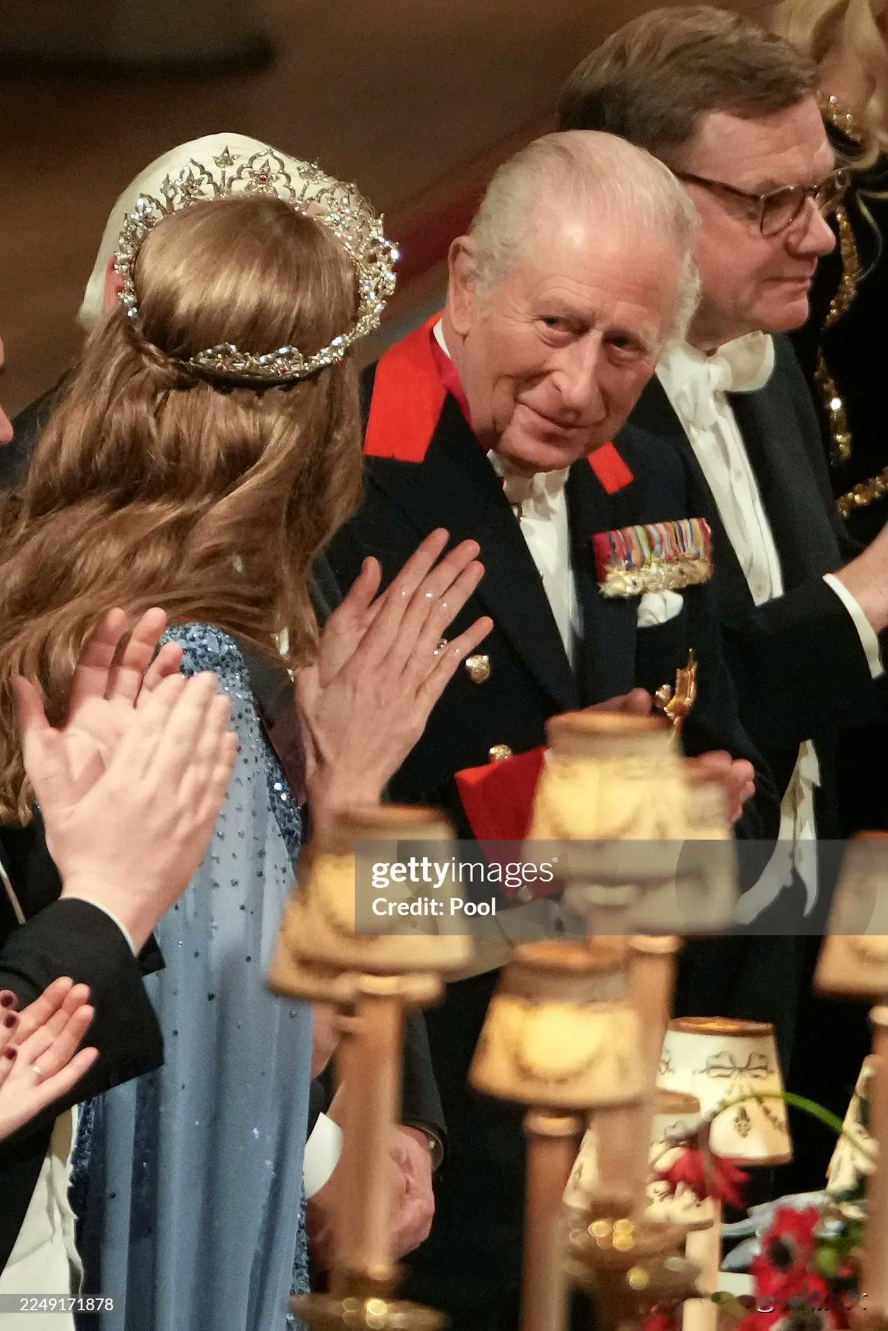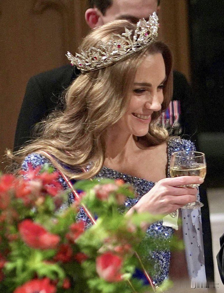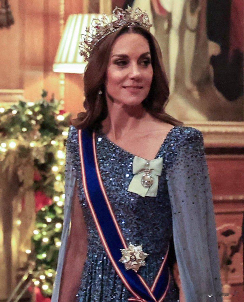 凯特解锁新王冠! 在昨晚的王室晚宴上,凯特一袭蓝色长裙,裙子上的亮片闪闪发光。