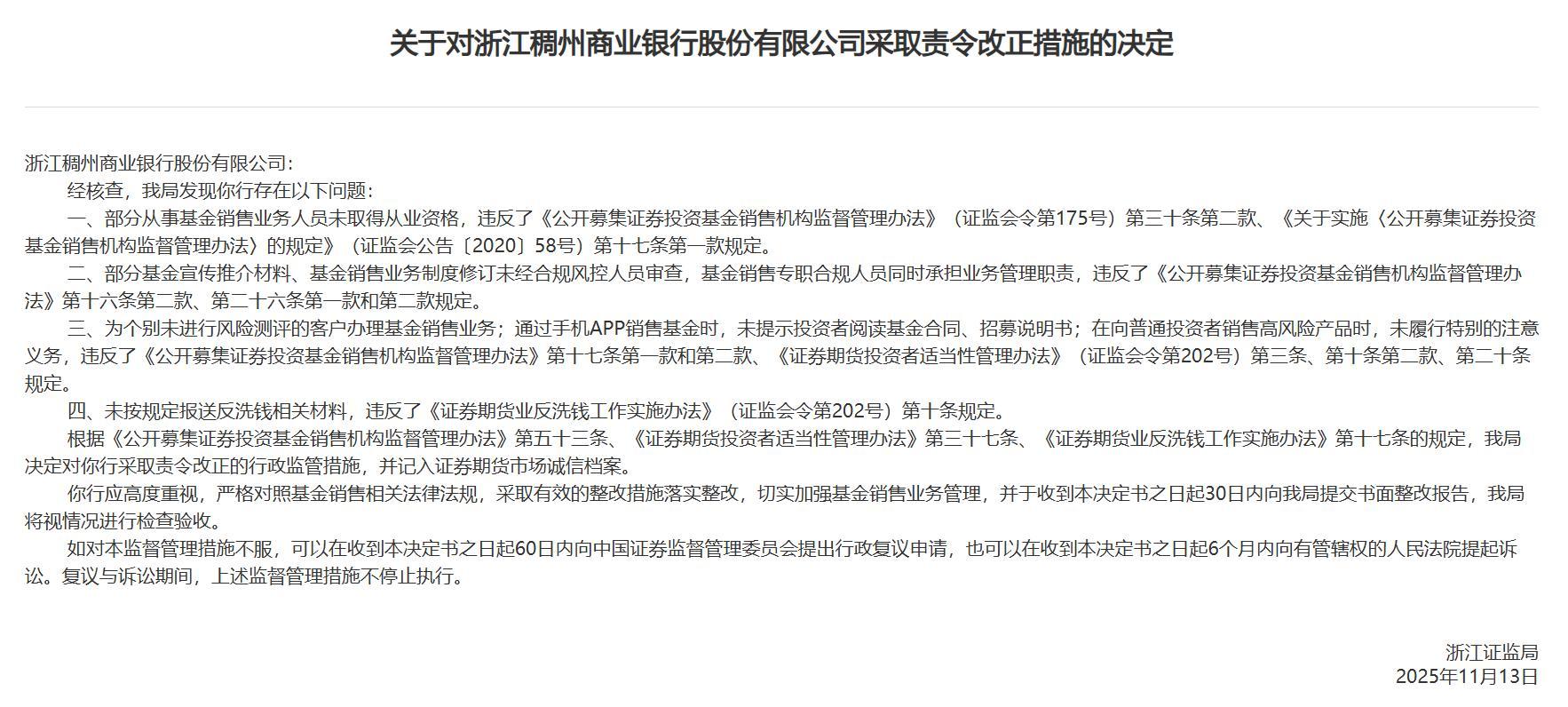 浙江稠州商业银行因4项基金销售违规遭责令整改