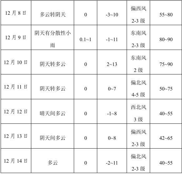 12月4日-14日商州区以多云天气为主,其中9日有弱降水,11日-13日气温下降明显,建议合理安排赛事相关工作,运动员及时添减衣物,谨防感冒,外出做好防护工作。