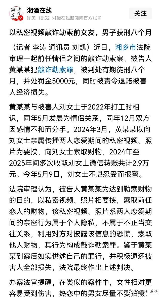 这起发生在湖南湘潭的案件,听起来令人心痛却并不罕见。一个男子利用与前女友的私人视频和照片作为“筹码”,以要挟的手段逼迫她不断汇款,累计达到两万九千多元,然而钱财并未平息他的贪欲,反而变本加厉,导致前女友不得不选择报警自救。 伤人案女孩骗男友案 这种事情之所以频频出现,背后反映的不仅是个别人的道德沦丧,更是如今数字时代隐私保护的复杂挑战。一旦私密影像被掌握,受害者常常陷入情感和经济的双重困境——害怕受辱、害怕失去尊严,又不得不面对不断的勒索。 更值得我们反思的是,人性的弱点和社会的法律如何共同防护我们的个人信息安全。受害者能勇敢站出来,报警维权,已经是智慧和勇气的体现。对于类似事件,法律应当更加严厉打击,社会也需加强隐私保护意识和技术支持。 大家有没有遇到过类似让人窒息的“情感绑架”?或者你对隐私被威胁这件事有何看法?欢迎留言分享你的故事和观点,让我们一起为营造一个更安全、更公正的网络环境出一份力!