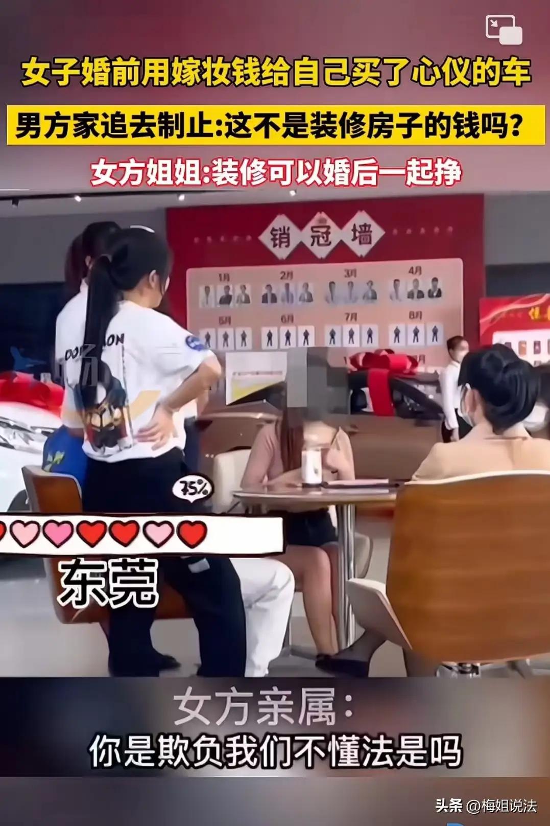 算盘打得太响了!广东东莞,一场关于房子和嫁妆的“财富博弈”引爆了网络热议。男子买房时没写女友的名字,似乎想把“家底”牢牢掌握在自己手中。可女子可没坐以待毙,她拿着自己的嫁妆,径直冲进4S店买了辆车,这一举动让男子家人彻底炸锅,立马赶到店里,怒斥女子:“这可是装修房子的钱,不能拿去买车!”女子姐姐直接回怼:“你以为我们不懂法律吗?别以为要欺负我们!” 彩礼之争 结婚买房吵架 这场看似家常的矛盾,却暴露了许多人心底深藏的“算盘”与权利意识。男子和家庭的“隐形规则”在现实面前瞬间崩塌,他们以为控制房产证就是掌握了全部,却没想到女子主动用嫁妆秀出自己的“底牌”——钱可以花走,但自尊和权益不能没。 问题的焦点不只在于房产证是否写名,而是女性在婚姻和家庭中如何保障自身利益的生存智慧。当房子只写一方名字,另一方尤其是女性怎样才能避免陷入“无名权”的困局?用嫁妆买车的举动,背后是对公平、独立和尊重的坚守。这不仅仅是对金钱的争夺,更是对话语权和人生选择的争执。 男子家人显然没料到女子会这样“回击”,他们的焦急和愤怒,其实反映了某些传统观念对现代女性权益的挑战。如今,很多年轻人意识到,婚前财产权益独立保护的重要性。嫁妆不再是简单的装饰品,而是女性自我保障的“藏金地”。 这起事件让人忍不住问:你身边有没有遇过类似的“家庭财产战”?当爱情与金钱交织,怎样才能既保护感情,又守住底线?是选择妥协,还是硬气反击?别光抱怨了,留言告诉大家你的看法,让我们一起扒一扒隐藏在婚姻里的那些“算盘”!