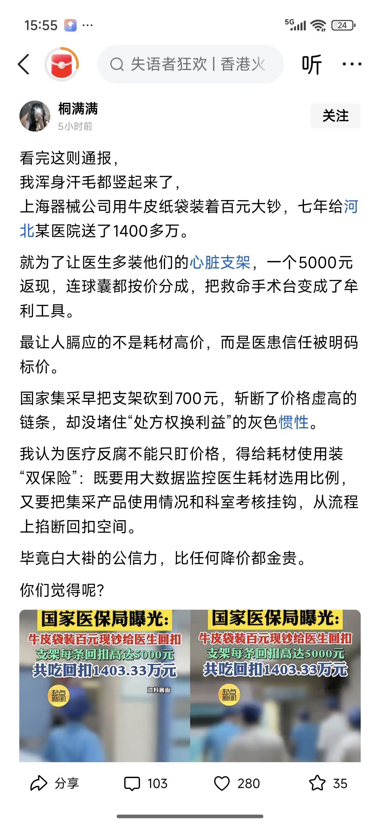 看完这个通告, 我汗毛都竖起来了! 牛皮纸装百元大钞给医生回扣,一个支架回5000。一共回了1403.33万元。 集采不是早就变成700了么?是怎么说服病患家属采用这个东西的呢? 你要不说都是小白鼠,一忽悠你这个好,你就用了。 我爸打了两个支架,当时一个一万多,国产的。那时候早,集采没有。所以很贵。 当时有个同村的,他认识医院的人,人家就没打,听说给捅了捅,疏散开了。真的,我们没有人在医院内,就打了。其实说还可以,用的还行。不想对当时的事情说三道四。 今天说的这个,是现在集采以后的事。 能理解,医生医院需要挣钱,适当放宽他们的收入。比这样偷偷挣回扣好一点吧! 八年大学,甚至11年大学,真的很辛苦。还有规培。心脏支架费用 医疗回扣 集采药价 支架价格 让他们这么暗箱操作,很完蛋。