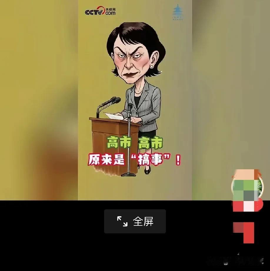 这下好了,不光地方台,高市都火到央视网啦 央视在播一首歌,这首歌的作者真的太有才啦,不信,你听: 海峡对面吹吹风,你就跳出来发疯,台湾有事就是日本有事,真是厚颜无耻,贼心不死,台湾的事是中国人的事,高市高市,关你屁事,借台湾生事,就是自己找事,记住了,中国人永远不怕事…… 后面还有很多,大家可以搜来听听,不管配图,作词,作曲,真的都太妙啦,听完顿觉神清气爽,高兴的我晚饭又多吃一个馒头。