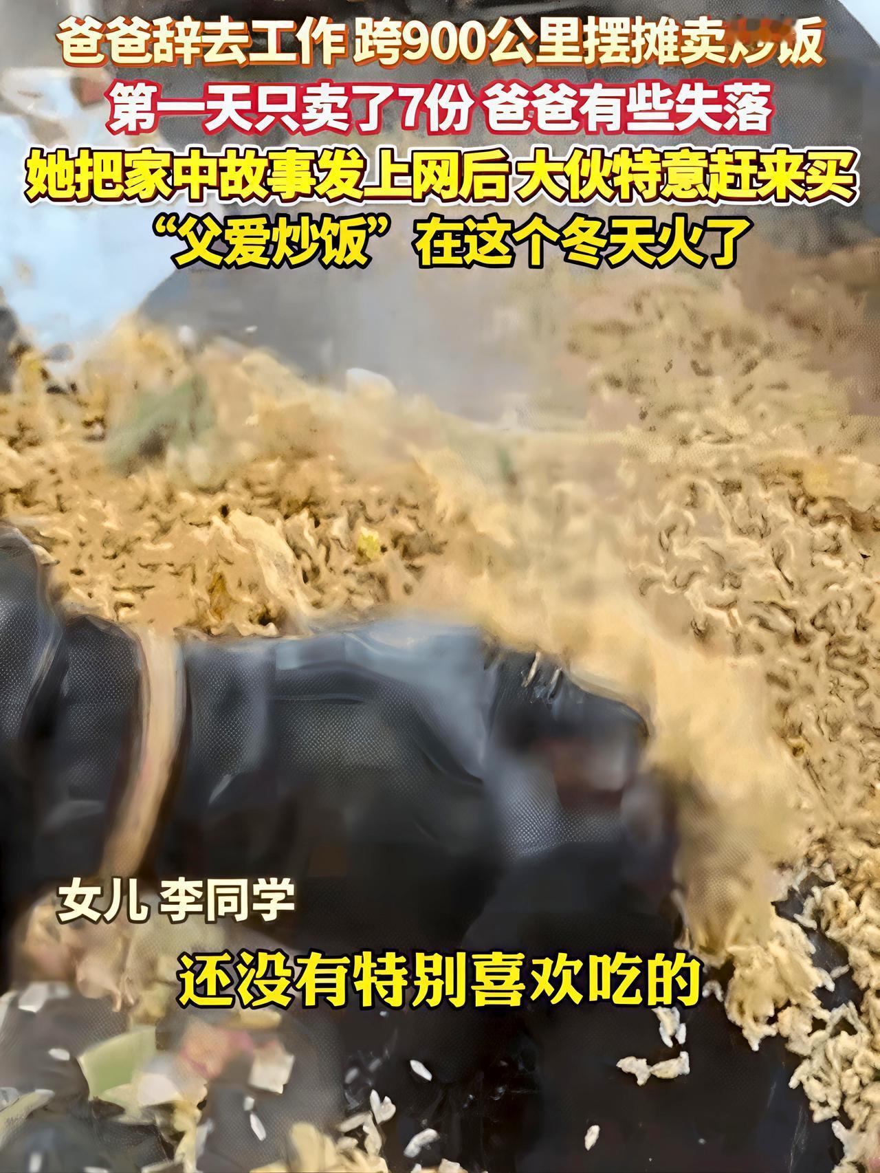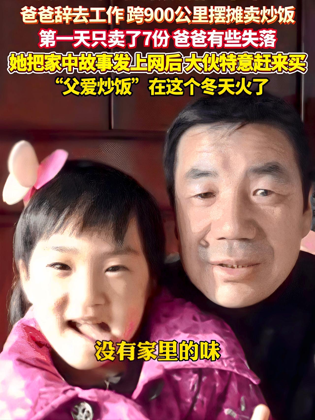 一个在吉林上大学的天津女孩,突然有天跟爸爸说,学校附近饭菜没家里好吃。 爸爸听了女儿的话,很是担心女儿吃的不好,尽然辞掉了天津的工作跑到吉林,在女儿学校旁边卖起了蛋炒饭。 结果开张第一天,就只卖了7份炒饭,赚的钱还没女儿做家教挣得多。这位爸爸心里有点难过,觉得自己没女儿能干。 女儿看到爸爸心里有点难过,她心里也很难过,当天就把爸爸从天津到吉林为了照顾自己的事,写成了一篇文章发到了网上。 可万万没想到!一下子就成了爆文,很多网友评论都很感动,甚至有的前来照顾爸爸的生意。 果然第二天,爸爸的摊子前就来了好多人,同学、老师、室友,还有专门从外地赶来的网友,都来买炒饭。 看到这么多人支持自己的爸爸,女该感动的哭了起来。 这位爸爸说,生意好全靠自己的女儿,所以他坚决不能丢女儿的面子,每天都会精心挑选最新鲜的食材,为他的女儿,为五湖四海的朋友,做最好吃,最干净的炒饭。 他还说,他会一直陪伴女儿。女儿毕业没找到工作前,会一直在吉林卖炒饭,等女儿工作稳定了,他才能安心的回天津老家。
