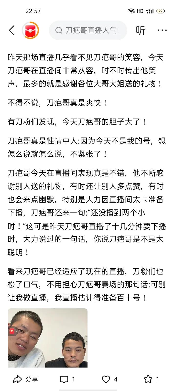 大力直播,刀疤哥来助阵! 想不到吧!刀疤哥在哪,哪里就礼物满天飞! 刀疤哥是个懂得感恩的人。大力一路照顾他到今天,进入决赛却不是大力播他了。 本以为这个好事就彻底与大力无缘了,没想到阴错阳差,刀疤哥退赛了!又重新拉拢到大力助播。 这不,今晚,刀疤哥反过来回馈大力!虽然播的时间短,但礼物满天飞! 大力啊,好起来了! 好人有好报啊!最朴素的人间情感,来自两个男人的惺惺相惜。 一开始,问刀疤哥,想大力了吗?还说没有。还说我一个男人想他干嘛? 后来随着刀疤哥越来越难,身体素质越来越差,刀疤哥竟然主动提起,说大力把他照顾的很好。从那开始,两个男人的友谊便开始了。 后来退赛,刀疤哥肯定明白了,如果大力在,一定不会让他犯那么多的错误。说鞋打滑,穿着别的品牌的衣服直播。 刀疤哥不语,他全懂了。所以,一下山,他就找大力合作直播。荒野刀疤哥 付出和收获不在同一个时段,大力出奇迹!大力值得!