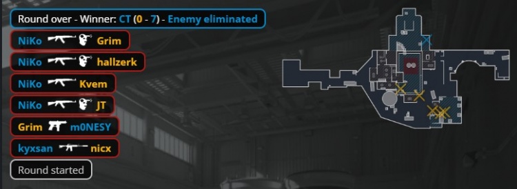 地图Nuke,上半场PUA先攻,手枪局PUA下管道失败被团灭,次回合PUA强起未果,开场Niko双杀奠定胜局,猎鹰连拿3分。来到长枪回合,北京小龙虾齐发力,猎鹰A点围剿PUA,随后猎鹰一路将比分扩大至6-0。第7回合Niko爆轰四杀,战绩来到12-1。