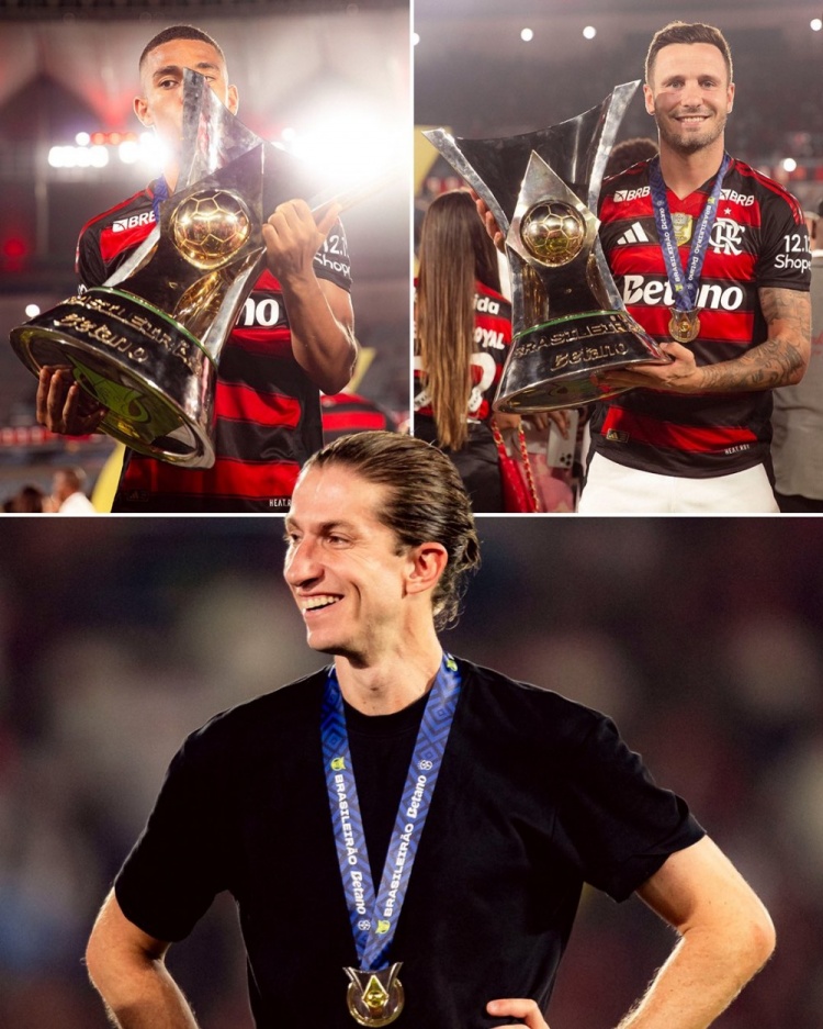 马竞官方晒出3人的照片,并配文:“菲利佩·路易斯、利诺和萨乌尔一周内为弗拉门戈队赢得了第二座冠军!祝贺你们,冠军们!”