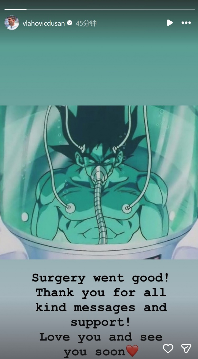 弗拉霍维奇接受了左腿内收肌肌腱撕裂修复手术,他在社交媒体上晒出《七龙珠Z》悟空在治疗舱里恢复的图片,配文:“手术很成功,感谢大家所有的祝福信息和支持!爱你们,很快再见!”