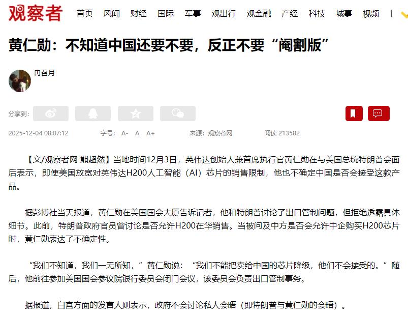 中国已经不需要美国的芯片了!当地时间12月3日,英伟达老板黄仁勋对特朗普直言:中国已经不稀罕美国的H200高端AI芯片了,就算美国放宽限制,中国也不一定要了。 英伟达 CEO 黄仁勋的一番表态让所有人看清了局势 —— 曾经被奉为 “算力神器” 的美国高端 AI 芯片,在中国市场已经不再是不可替代的选择。 就在几年前,英伟达的 GPU 芯片还占据着中国 AI 加速芯片市场 95% 的份额,几乎形成了垄断之势。美国方面也正是看中了这一点,不断加码出口限制,试图通过技术封锁遏制中国 AI 产业的发展。 但他们没料到,这种倒逼反而成了中国芯片产业突破的催化剂。从 2025 年上半年的数据来看,中国非 GPU 芯片市场占比已经达到 30%,而这个数字还在快速增长,有预测称到 2028 年将接近 50%,曾经被 GPU 垄断的市场格局正在被彻底改写。 中国企业没有选择在同一赛道上与巨头硬拼,而是走出了一条差异化的创新之路。北京的昆仑芯、寒武纪、摩尔线程、清微智能四家企业构建起自主可控的 “芯片矩阵”,其中三家都聚焦于非 GPU 架构,这种布局恰好避开了传统 GPU 赛道的竞争红海。 清微智能的可重构 AI 芯片堪称中国版 “通用型 TPU”,技术源自清华大学实验室,通过架构创新而非单纯的制程竞赛实现性能突破,一台搭载其 TX81 芯片的服务器就能支撑万亿参数大模型部署,整体成本降低 50% 的同时能效比还提升了 3 倍。 这种兼顾效率与成本的解决方案,正好击中了市场的核心需求,截至目前其芯片累计出货量已经超过 3000 万颗,AI 算力卡订单量也突破 2 万张,跻身国产商用类企业第一梯队。 在高端芯片领域,国产产品的性能也已经实现了跨越式提升。阿里平头哥推出的 PPU 芯片,在多个关键参数上已经比肩英伟达 H200,显存容量同样达到 96G,卡间互联带宽和 PCIe 接口表现不落下风,而功耗却比 H200 低了 150W,更符合绿色算力的发展趋势。 华为昇腾系列芯片也在持续迭代,最新款产品在实际应用中已经展现出强劲的竞争力。这些国产芯片不再是 “勉强可用” 的替代品,而是在部分场景下实现了 “优于进口” 的表现,让中国企业有了更多自主选择的空间。 产业生态的完善让这种自主替代变得更加坚实。不仅是芯片设计环节,整个产业链都在加速补位。 12 月初,探路者以 6.8 亿元收购两家芯片公司,布局 AI 端侧核心赛道,补齐了感知与显示领域的技术短板;更多企业通过技术创新和资本运作,构建起 “芯片 + 算法 + 终端” 的完整生态闭环。 从云端算力到终端设备,从消费电子到工业制造,国产芯片已经实现了全场景覆盖,这种系统性的突破,远非单一产品的替代所能比拟。 美国方面显然也意识到了这种变化。此前英伟达推出的 “减配特供版” H20 芯片,在第三季度仅创造了 5000 万美元的收入,中国买家的冷淡反应已经说明了一切。 黄仁勋多次向美国政府游说,强调将中国市场拱手让人是 “严重错误”,因为全球 50% 的 AI 研究人员都在中国,失去这个市场就意味着失去了技术迭代的重要土壤。 但形势比人强,当中国企业已经掌握了自主可控的技术路径,当国产芯片在性能、成本、能效上都具备了竞争力,美国再想通过放宽限制来挽回市场,显然已经错过了最佳时机。 这种转变背后,是中国坚持自主创新的战略定力,也是市场选择的必然结果。中国从来没有主动寻求技术对抗,而是始终秉持开放合作的态度,但在核心技术上,从来没有放弃过自主可控的追求。 从清华大学的实验室到企业的生产线,从政策支持到资本投入,无数人默默付出,才换来了今天的突破。 这种突破不是一蹴而就的,而是多年积累的厚积薄发,是大国风范在科技领域的生动体现 —— 不卑不亢,脚踏实地,用实力说话。 如今,黄仁勋的表态已经给出了明确的信号,美国芯片在中国市场的垄断地位已经成为过去。但这并不意味着中国会关闭合作的大门,而是在平等互利的基础上,拥有了更多话语权和选择权。 国产芯片的崛起,不仅改变了全球芯片市场的格局,更让我们看到了自主创新的巨大力量。 面对这样的科技变革,我们不禁要问:当中国芯片产业持续发力,未来还会带来哪些惊喜?在全球科技合作与竞争并存的格局下,你认为国产芯片接下来最需要突破的领域是什么?欢迎在评论区留下你的看法。