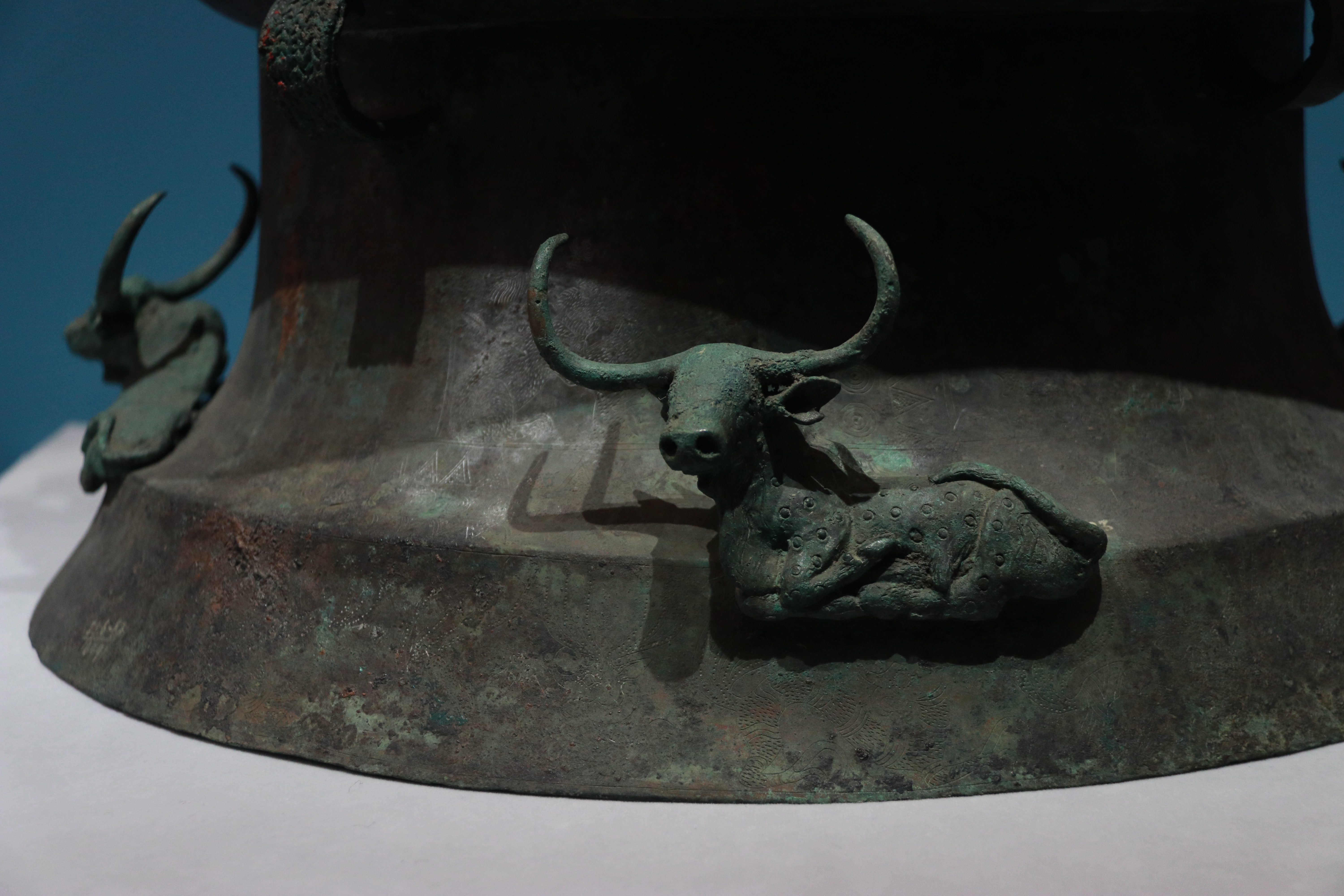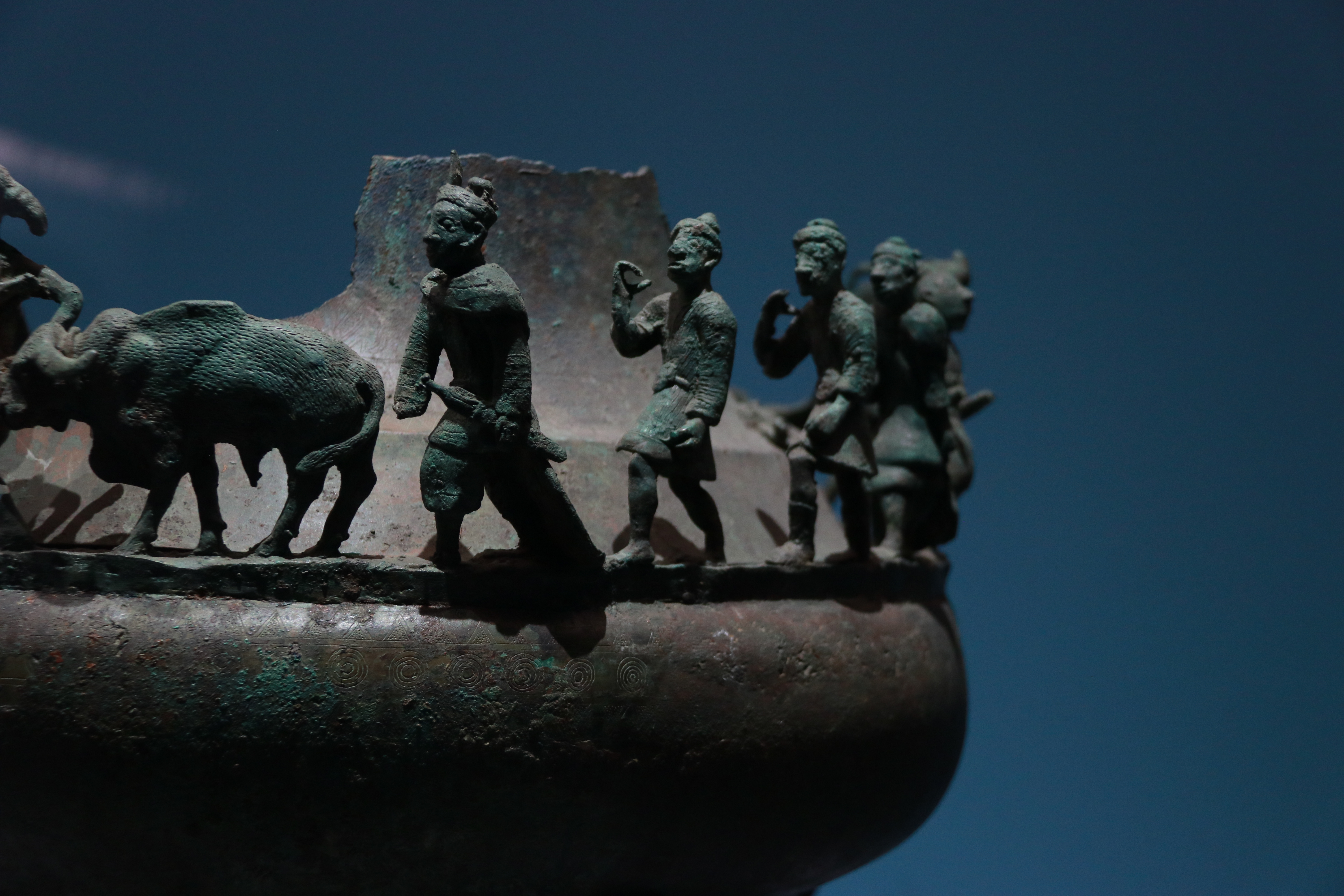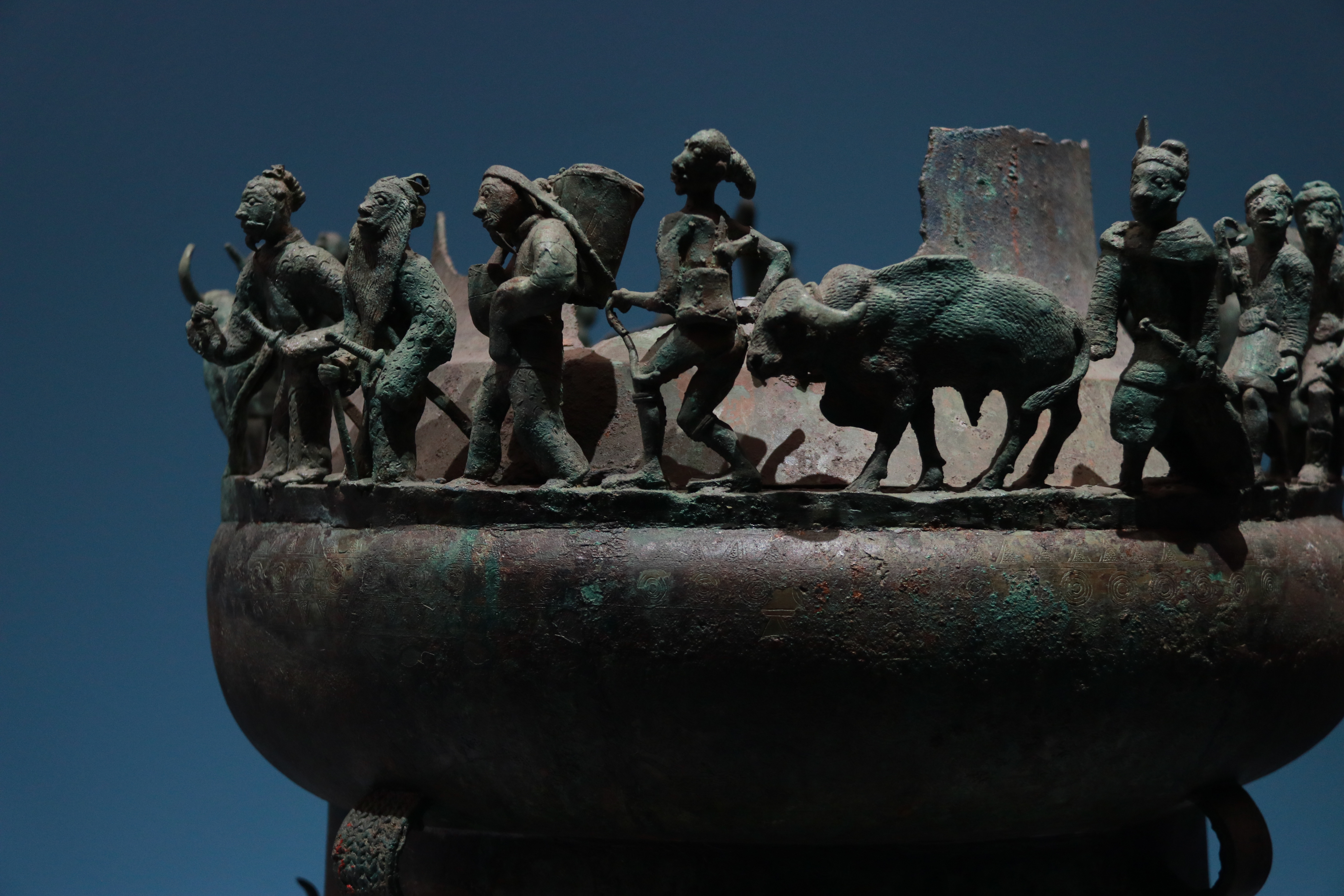 贡纳场面贮贝器 西汉 中国国家博物馆藏云南晋宁石寨山第13号墓出土,此件贮贝器最独特之处在于其生动立体的人物场景,它属于“叠鼓形”贮贝器,但出土时上半部分已残损,现在我们看到的是其下半部分。在残高约40厘米的鼓身口沿上,铸造有由17个人物、2头牛和2匹马组成的行进队伍。这些人物高约9-10.4厘米,服饰、发型和携带的物品各不相同。他们有的头顶箩筐,有的牵着牛马,正朝着同一方向前进,艺术地再现了各部落向滇王纳贡的场面,极具动感。来国博看中国我的2025博物馆之旅