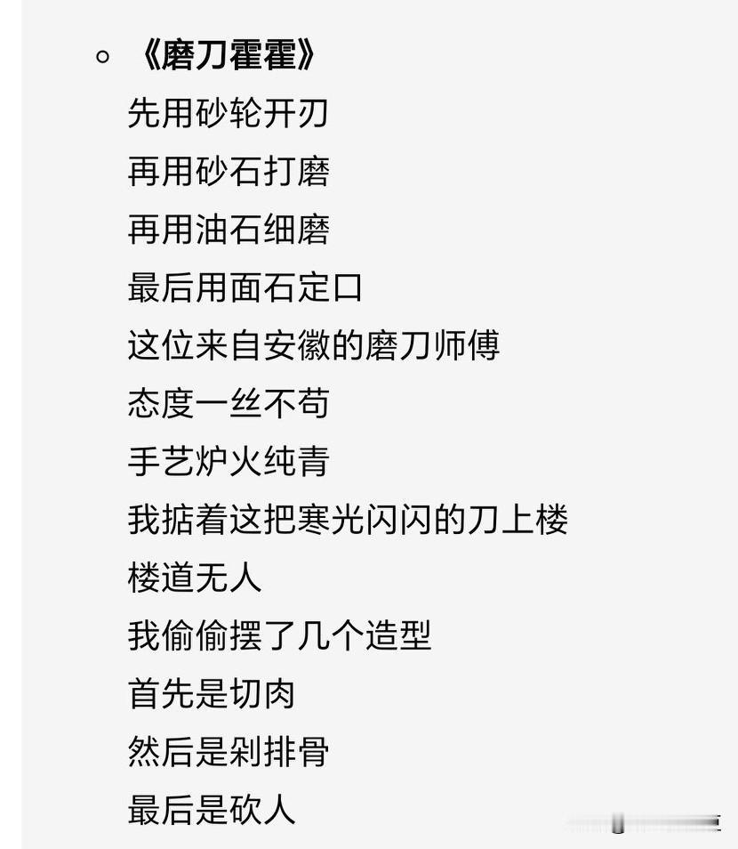偶然拜读了梨花体诗歌,颠覆了对诗歌的认知,打破了成为诗人的门槛,不愧是中国当代口语诗的重要探索,其价值体现在对诗歌边界的突破、生活本真的回归以及人文精神的暗藏表达! 它打破诗歌精英化壁垒,让诗歌回归大众 梨花体摒弃了传统诗歌的韵律、意象堆砌和宏大叙事,以口语化分行、日常琐事为创作核心。 比如《一个人来到田纳西》仅用四句直白的口语,就将个人生活中的小确幸转化为诗意表达。这种“以浅写生活”的方式,让诗歌走出小众文坛的象牙塔,普通人能轻易理解并产生共鸣,实现了“把诗歌的高尚还给普通人的心灵”的创作初衷。 它扎根生活的细节书写,暗藏真实的人文观察。 如《磨刀霍霍》中详细描写砂轮开刃、砂石打磨等磨刀工序,既还原了民间手艺人的工作状态,又通过“偷偷摆砍人造型”的细节,勾勒出人性中隐秘的情绪与真实的自我。这种对生活的精准描摹,让诗歌成为记录时代、观察人性的载体,体现了“艺术来源于生活”的创作本质。 它直白背后的隐喻与哲思,以极简形式承载深意。看似口水化,实则暗藏隐喻与哲学思考。 例如《我终于在一棵树下发现》以“一只蚂蚁,另一只蚂蚁,一群蚂蚁”的简单句式,隐喻人类在宇宙中的渺小与群体的未知性;而《想着我的前世今生》对公共卫生间不冲水行为的吐槽,实则是对公共道德缺失的批判。这种“以直白表深刻”的表达,让诗歌在极简形式中承载了对人性、社会的思考。 看来我们都要重新认识诗歌,理解诗歌,懂得诗歌,争取人人都能成为大诗人,让诗歌文化闪耀华夏!