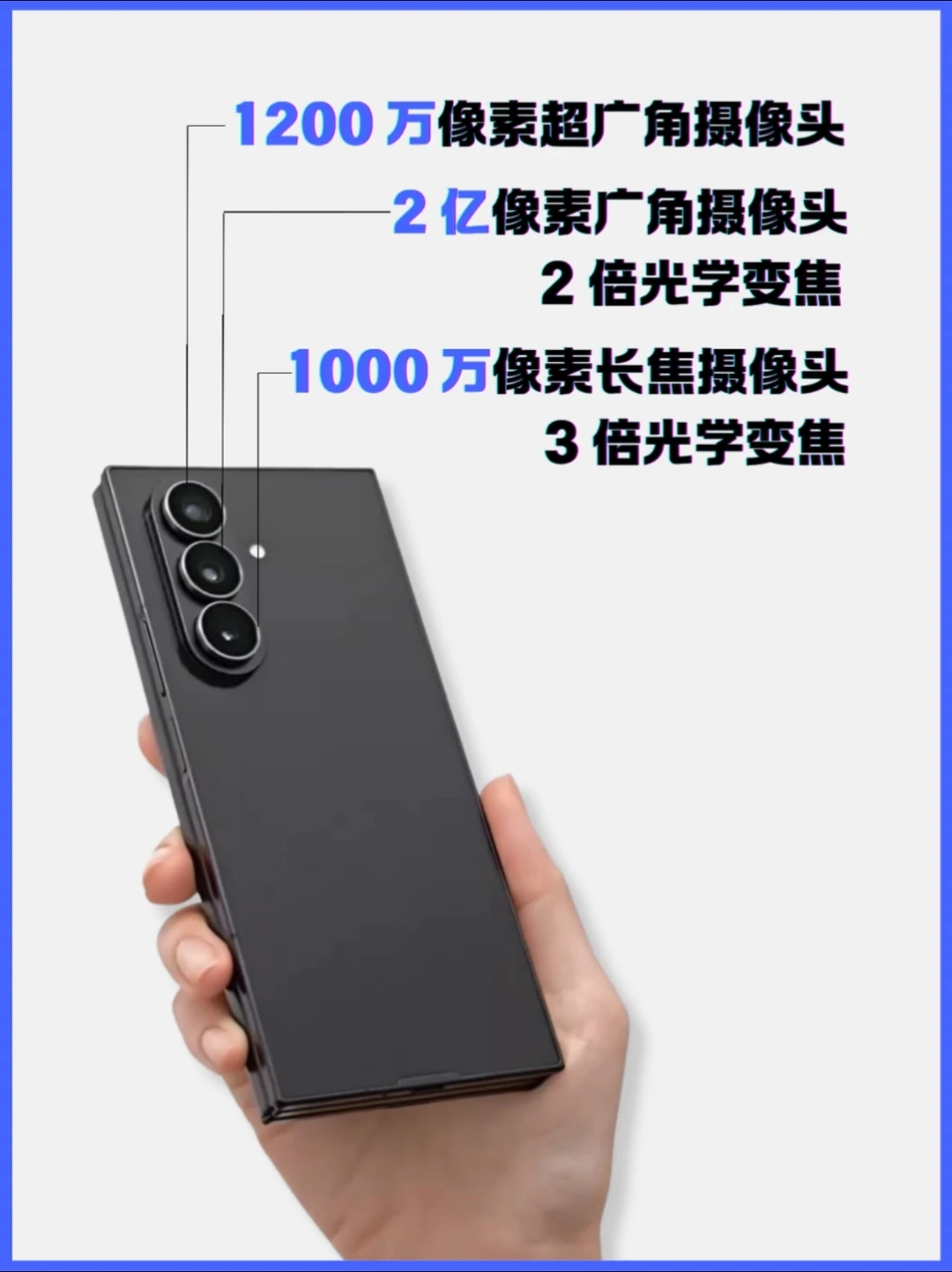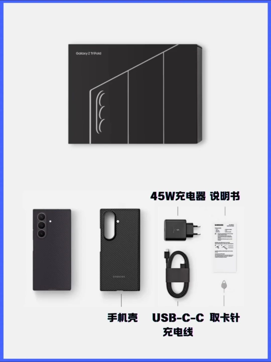 开箱上手三星新品Galaxy Z TriFold三折叠手机 1.屏幕: 6.5英寸外屏,展开为10英寸屏幕 2.机身: 机身薄仅3.9毫米,重约308克 3摄像头: 主摄2亿像素广角传感器2倍光学变焦 1200万像素超广角 1000万像素长焦镜头 3.处理器: 搭载三星定制骁龙8 Elite处理器,标配16GB运行内存 4.容量: 提供512GB和1TB储存版本选择 5.电池: 5600毫安电池,45w快充 6.价格: 售359.04万韩元,约合17299