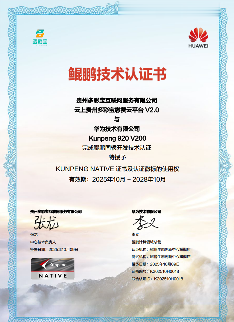 多彩宝作为贵州广电网络传媒集团旗下的重点国有企业,是一家集“数字政务+数字民生+数字商务”于一体的大数据科技服务企业。公司通过打造“云上贵州多彩宝”政务民生与数字经济平台,有效连接用户、企业与政府,充分发挥桥梁纽带作用。选择携手鲲鹏同辕开发创新打造新一代缴费云平台,不仅是追求性能的提升,更是构建高性能、高安全、高可靠现代民生数字基础设施的战略选择。此举既解决了当前高并发、数据安全等业务痛点,也为核心系统的长期演进与持续发展奠定了坚实基础。目前该方案已经顺利获得了KunpengNative认证。