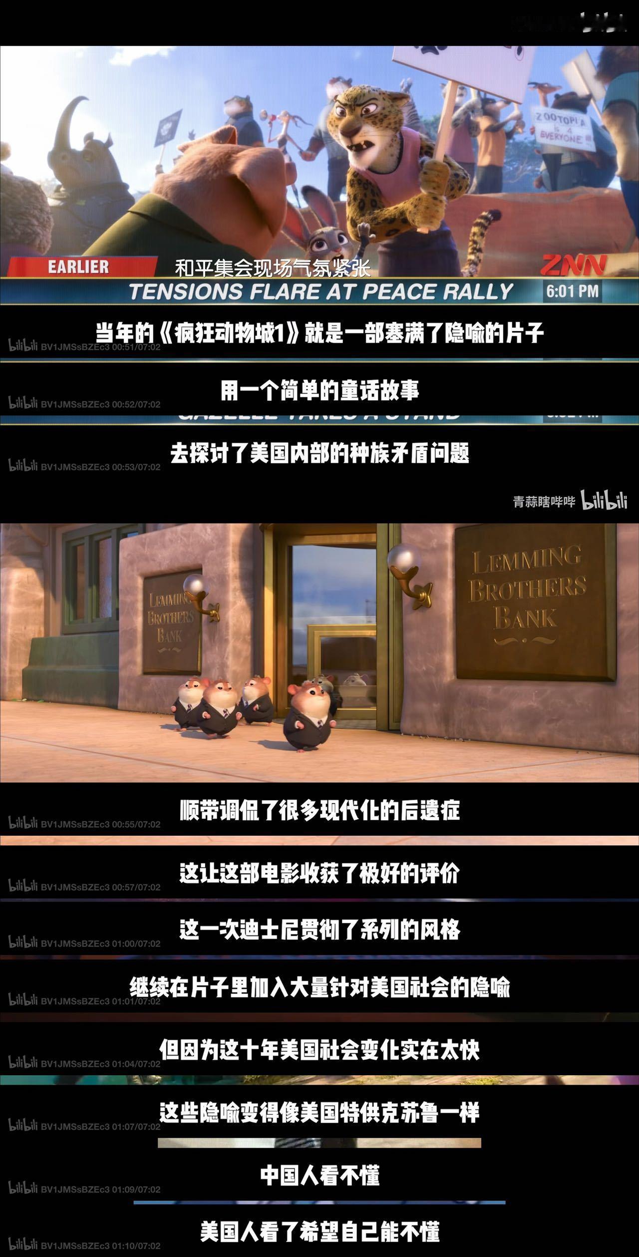 用Zoo和Utopia组合成“动物乌托邦”暗示披着童话外衣下的和平相处宣言,导演的小巧思真的太妙了💧同样的小巧思还存在于电影本身🥹比如第一部有大量的隐喻,拆解M国社会,来自乡下的朱迪只身闯荡大城市,让人不禁共情心疼这个小兔子!第二部更是隐喻M国的特色,市长表演欲旺盛、地下世界有大先生这种黑道教父、爬行动物暗示哪些群体...小破站上有阿婆主分析了《疯狂动物城2》的原型解析,看了你就会知道电影中还存在哪些隐喻了!