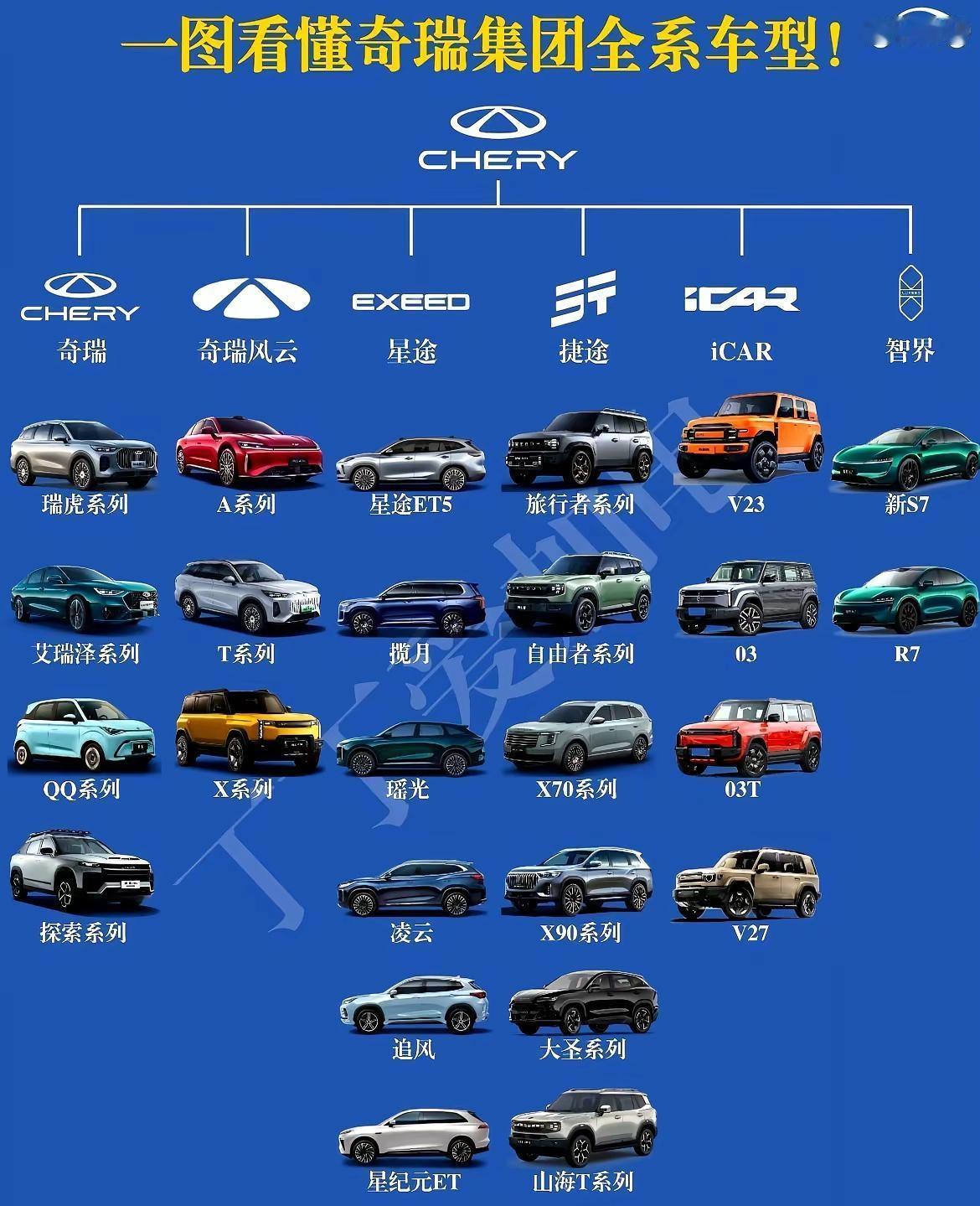 我一直以为奇瑞就是造QQ的那个厂子,顶多再加个满街跑的瑞虎。 今天我才发现,我错了,错得离谱。 这哪是个汽车厂啊,这简直是一支分工明确的“集团军”。 老大哥“奇瑞”自己,是绝对的主力部队,瑞虎、艾瑞泽这些,就是冲在最前面的正规军,稳扎稳打,保住基本盘。 以前总觉得国产车差点意思,现在再看奇瑞这盘棋。 从几万块的小电车,到三四十万的智能旗舰,从家用到越野,从燃油到纯电…… 它好像在说:甭管你是谁,预算多少,想干嘛去, 我这里总有一款车适合你[赞][赞]