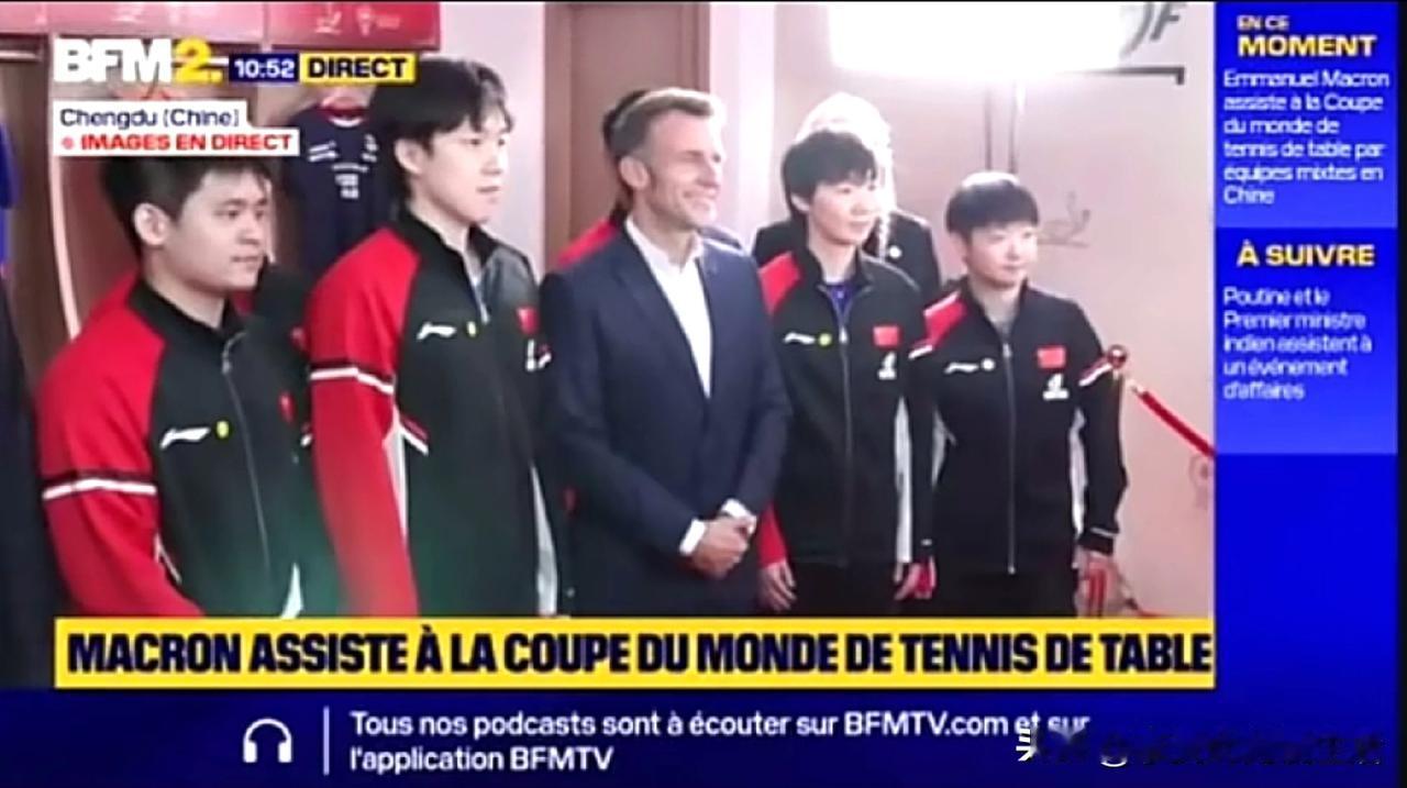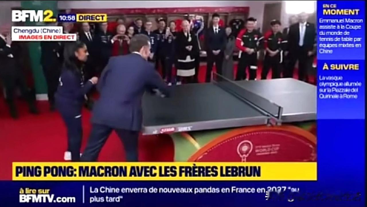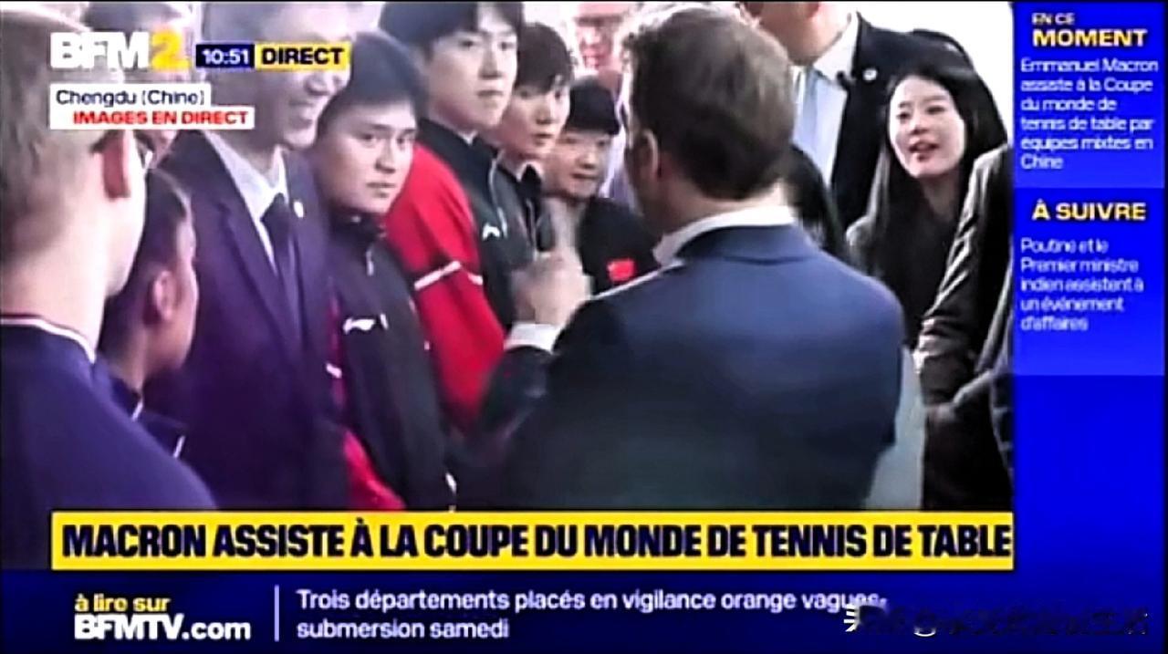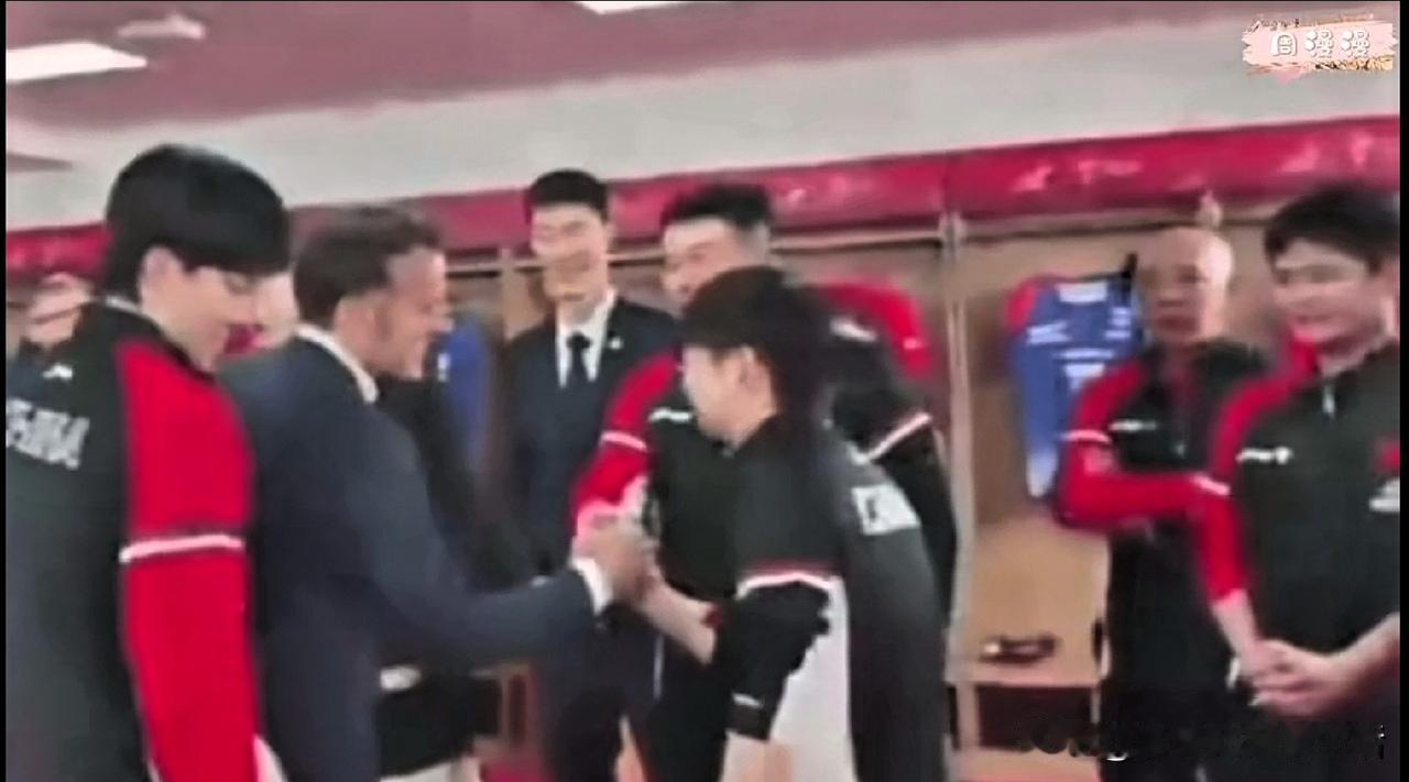 法国总统握着孙颖莎的手不撒开。法国总统马克龙与混团世界杯中法球员互动。握手环节马克龙竟然握着莎莎的手不撒开。打球互动时马克龙首先点名要和莎莎打球。因为会见流程最先安排的是男双,于是马克龙与小布和王楚钦,林诗栋先进行男双。随后马克龙再次喊莎莎,我们的王主席才把莎莎推到前面来。看来马克龙是真喜欢孙颖莎,竟然打了很长时间,即便接不住莎莎的发球还是要再打一会儿。合影环节我注意到孙颖莎全程很自然的退到边上不显眼的地方站定。这次中法互动小将有林诗栋但是全程没看见蒯曼。