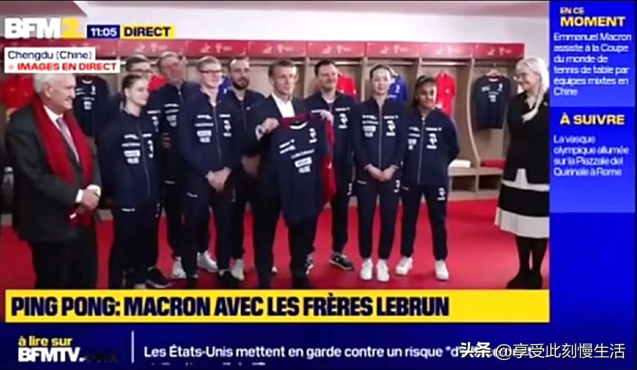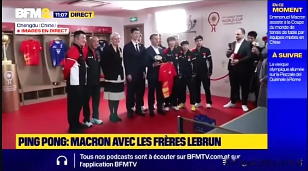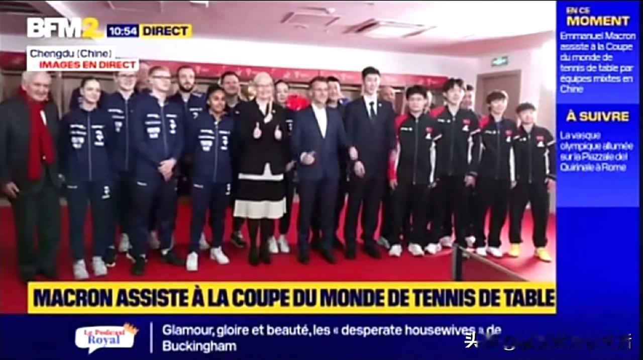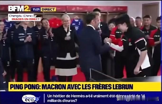 法国总统握着孙颖莎的手不撒开。法国总统马克龙与混团世界杯中法球员互动。握手环节马克龙竟然握着莎莎的手不撒开。打球互动时马克龙首先点名要和莎莎打球。因为会见流程最先安排的是男双,于是马克龙与小布和王楚钦,林诗栋先进行男双。随后马克龙再次喊莎莎,我们的王主席才把莎莎推到前面来。看来马克龙是真喜欢孙颖莎,竟然打了很长时间,即便接不住莎莎的发球还是要再打一会儿。合影环节我注意到孙颖莎全程很自然的退到边上不显眼的地方站定。这次中法互动小将有林诗栋但是全程没看见蒯曼。