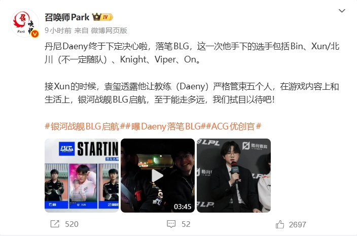 直播吧12月06日讯微博媒体(召唤师Park)昨晚爆料,iG主教练Daeny与BLG签约落笔,将在下赛季为BLG俱乐部执教。