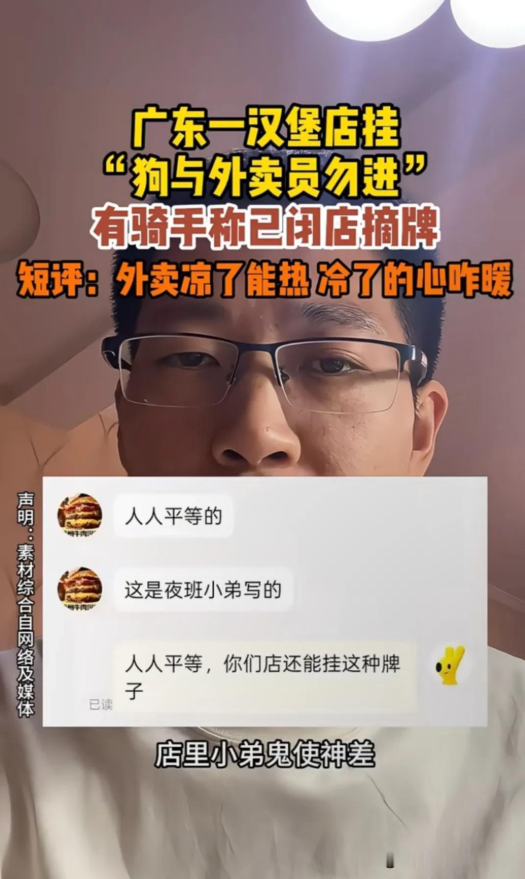 这老板真倒霉!广东一家牛肉汉堡店,有顾客吐槽送来的汉堡都冷了,店里竟然回复称,建议顾客直接投诉骑手,因为这是骑手的问题。到这,也就是店家背刺了一个骑手的事,还没什么! 后面店里小弟脑子也不知道咋想的,直接在店里挂了张牌子“禁止犬吠 厨房重地 狗与外卖员勿进” 这下彻底寒了外卖员的心,众多外卖员纷纷跑到店外打卡。甚至由于老板吓着了,摘牌闭店动作太快,很多外卖员后悔自己骑得太慢,没打上卡… 网友:那老板也是倒霉,雇的夜班小弟直接把他害到倒闭了!