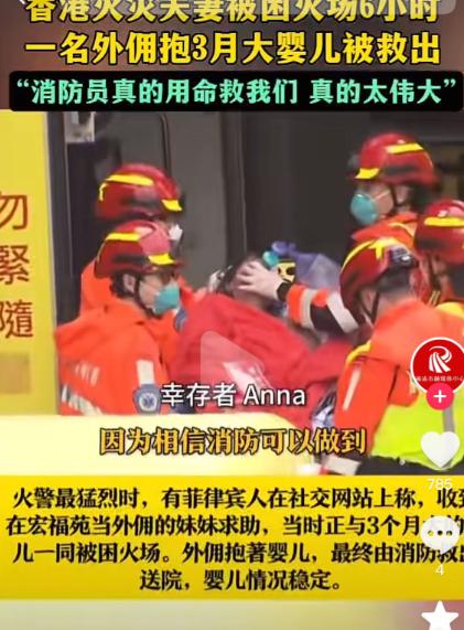 人间有真情,香港这名菲佣火了!她和雇主家三个月大的女婴一同困在火场,她不仅没有选择独自逃生,反而将最大的生还机会留给了孩子。最终,她们成功等到了救援。   消防云梯刺破浓烟的瞬间,围观人群里爆发出一阵压抑已久的欢呼。被浓烟熏得满脸黑灰的女子怀里,那个三个月大的女婴竟还在安稳睡着,粉嫩的小脸被紧紧护在女子胸前,几乎没沾到半点烟尘。谁也没想到,这个在生死关头把生的希望全给了孩子的,是雇主家的菲佣。   现场的灼热感还未完全散去,消防队员小心翼翼地将女子和孩子从二楼窗口接下。女子的手臂和脸颊有轻微灼伤,可她始终没松开抱着孩子的手,直到确认孩子被交到医护人员手中,才脱力地瘫坐在地上,嘴里反复念叨着雇主的名字。   事情要从当天午后说起。雇主夫妇因急事外出,留下菲佣独自照看刚满三个月的女婴。原本平静的午后,被一阵刺鼻的焦糊味打破。菲佣起初以为是厨房的电器出了问题,刚要起身查看,就看到客厅门缝里渗进滚滚黑烟。   火势蔓延的速度远超想象,浓烟很快灌满了整个屋子,呛得人无法呼吸。菲佣第一时间冲到婴儿床边,抱起熟睡的孩子。此时,卧室的门还能打开,楼道里虽有烟雾,但隐约能看到逃生的方向。   按照常理,她完全可以抱着孩子顺着楼道逃生。可刚走到门口,她就发现楼下的火势已经封住了楼梯间,滚烫的火苗时不时窜上来,成年人尚且难以通过,更别说怀里还抱着一个毫无抵抗力的婴儿。   退回到卧室后,她迅速关上房门,用湿毛巾堵住门缝,减少浓烟进入。紧接着,她又找来被子浸湿,裹在孩子身上,自己则用湿毛巾捂住口鼻,紧紧抱着孩子蹲在靠近窗口的位置。她知道,窗口是唯一能让外界发现她们的地方,也是唯一的求生希望。   浓烟不断从门缝钻进来,卧室里的空气越来越稀薄,菲佣的呼吸变得越来越困难。但她始终把孩子护在身下,尽量让孩子远离浓烟最密集的区域。为了不让浓烟呛到孩子,她甚至用自己的衣服盖住孩子的头部,只露出小小的鼻孔供呼吸。   外面的呼救声、消防车的鸣笛声越来越近。菲佣用尽最后一丝力气,挣扎着爬到窗口,挥手呼喊。消防队员很快发现了她们,迅速架设云梯展开救援。   在等待云梯靠近的几分钟里,她全程保持着护着孩子的姿势,哪怕手臂被掉落的灼热碎屑烫伤,也只是咬着牙忍耐,生怕动静太大惊醒孩子,或是让孩子受到惊吓。   当云梯终于抵达窗口时,消防队员看到的就是这样一幕:女子浑身是灰,眼神因缺氧而有些涣散,却死死抱着怀里的孩子,孩子被裹得严严实实,安稳得仿佛只是在睡一个普通的午觉。   后续检查显示,孩子除了受到轻微惊吓外,身体并无大碍。而菲佣因为吸入过多浓烟和轻微灼伤,需要住院观察。雇主夫妇赶到医院后,看到安然无恙的孩子和受伤的菲佣,当场红了眼眶,紧紧握着她的手连声道谢。   这段救援视频被传到网上后,很快引发了全网热议。网友们纷纷为这位菲佣的善良和勇敢点赞,有人说“这不是简单的雇佣关系,这是把孩子当成了自己的亲人”,也有人感慨“在生死关头的选择,最能看清一个人的本心”。   其实,在我们身边,总有这样一些不期而遇的温暖。它可能来自朝夕相处的亲人,也可能来自毫无血缘关系的陌生人。就像这位菲佣,她用自己的行动诠释了什么是责任与善良,也让我们看到,人间自有真情在。   不知道大家在生活中,有没有遇到过这样温暖人心的陌生人?欢迎在评论区分享你的经历,让这份温暖继续传递下去。
