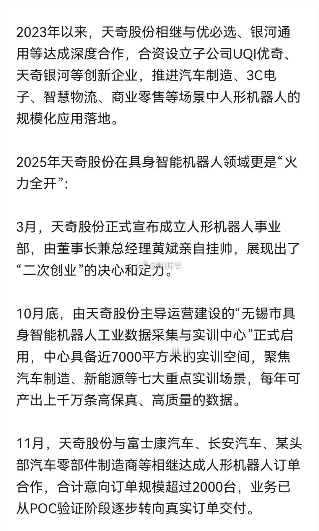 天奇股份在“人形机器人”领域火力全开:与富士康汽车、长安汽车、某头部汽车零部件制
