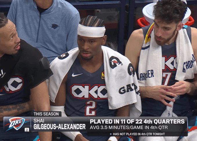 赛季至今,亚历山大共出战23场,12次三节打卡,只有11场出战了第4节。按场均来算,亚历山大本赛季场均第4节只打了3.5分钟。