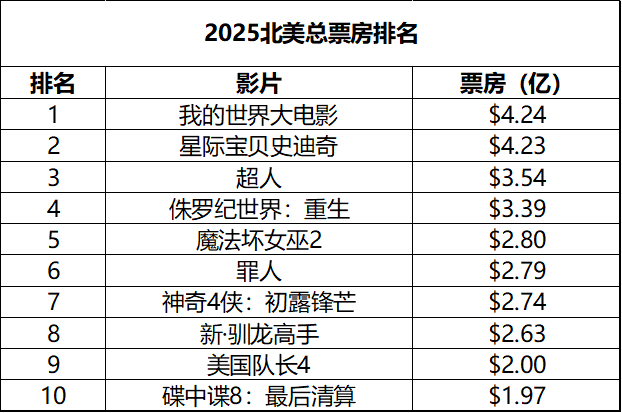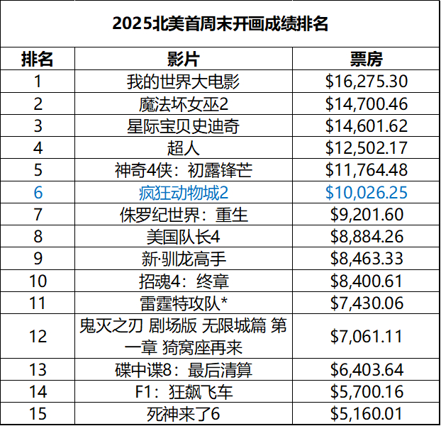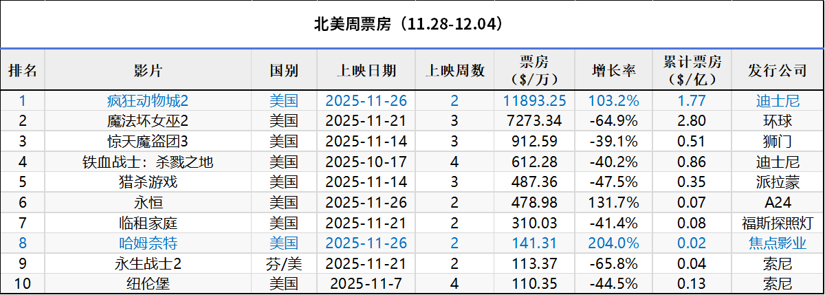 2025年第48周北美票房 :1.《疯狂动物城2》开画夺冠,全球劲收6.62亿美元空降年度第6;2.《魔法坏女巫2》累计票房2.8亿美元排名年度第5,全球票房破4亿美元;3. 赵婷新片《哈姆奈特》小规模点映上榜。(数据:boxofficemojo)