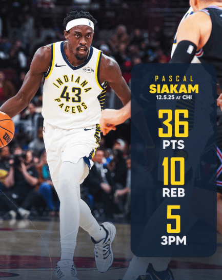 步行者官方更新ins:帕斯卡尔-西亚卡姆砍下36分两双