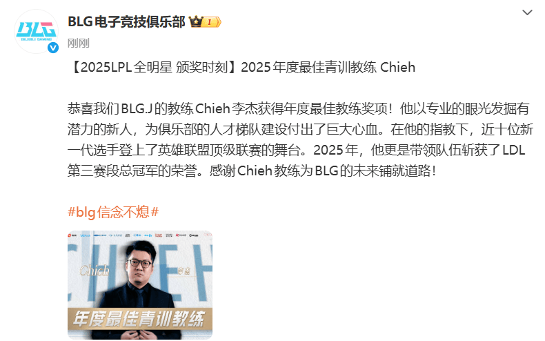 恭喜我们BLG.J的教练Chieh李杰获得年度最佳教练奖项!他以专业的眼光发掘有潜力的新人,为俱乐部的人才梯队建设付出了巨大心血。在他的指教下,近十位新一代选手登上了英雄联盟顶级联赛的舞台。2025年,他更是带领队伍斩获了LDL第三赛段总冠军的荣誉。感谢Chieh教练为BLG的未来铺就道路!