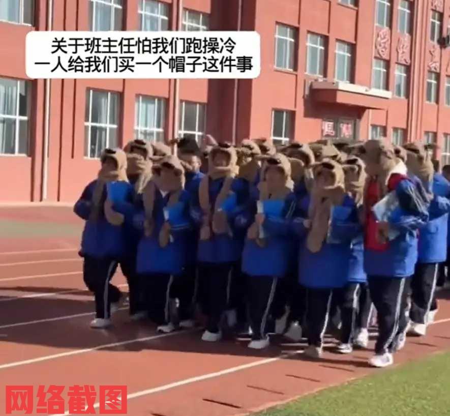 山东有位班主任老师在天冷后买帽。 这是老师自费买给班级每位同学的一顶防寒帽,以
