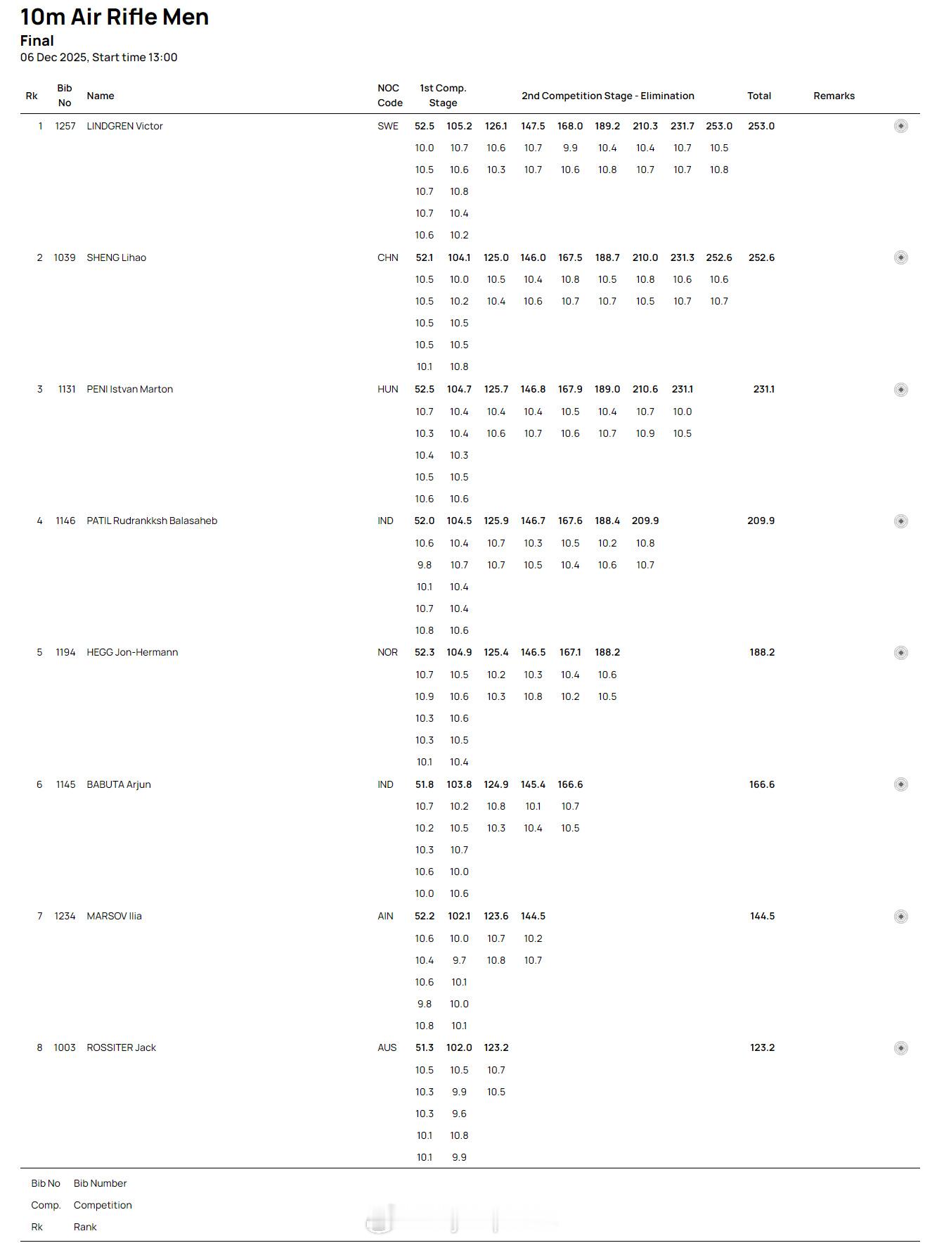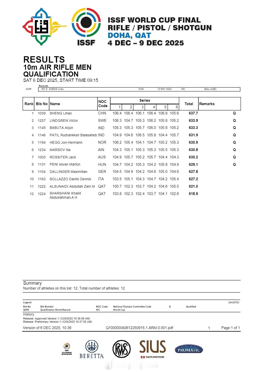 【射击世界杯总决赛盛李豪惜败摘银】国际体坛战报速递 12月6日多哈,2025年射击世界杯总决赛首个决赛日。在男子10米气步枪决赛中,资格赛高居榜首的奥运冠军盛李豪在前半程发挥一般,后半程奋起直追,以0.4环之差惜败巴黎奥运亚军瑞典林德格伦,未能卫冕,成绩为252.6环。匈牙利潘尼摘得铜牌。