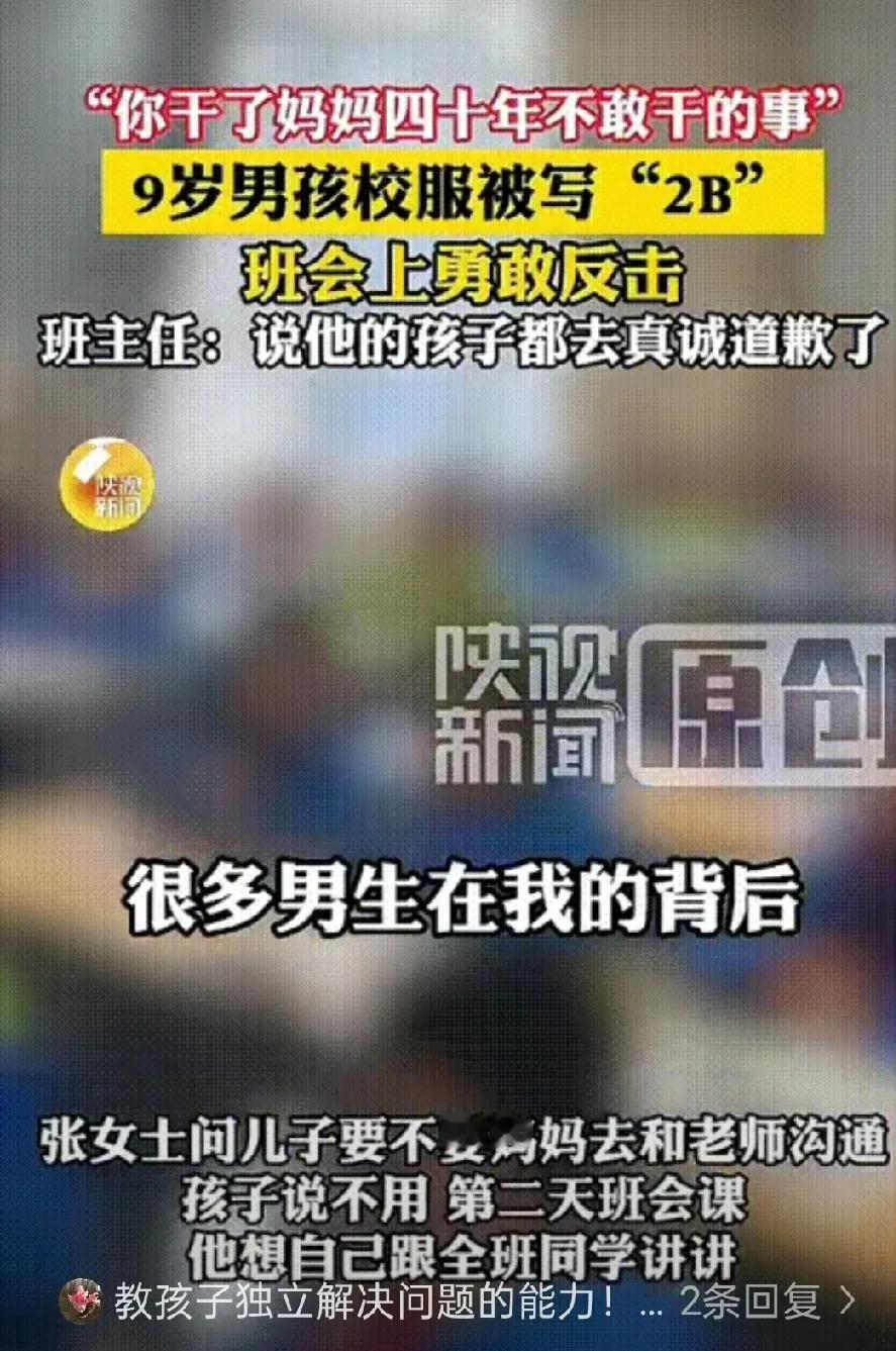 西安icon这位9岁男孩也太刚了! 妈妈发现他校服背后被人写了“2B”,得知孩子被同学嘲笑了两天,气得想找班主任讨说法,没想到男孩竟淡定说:“妈妈,明天班会我自己解决!” 这波操作,让妈妈又骄傲又感动:“他干了我40年来不敢做的事!” 校服被写脏话遭嘲笑两天,不找家长不哭闹,自己一招解决问题,这格局比成年人还大! 妈妈发现孩子校服背后被涂了“2B”,得知孩子忍了两天嘲笑,气得要找老师讨说法,没想到男孩淡定拒绝,坚持要自己在班会上处理。周五班会课上,他没有指责谩骂,只是真诚发问:“你们被欺负我会帮忙,你们这样对我,觉得对吗?”简单一句话让教室瞬间安静,犯错的同学当场落泪道歉,全班响起掌声。 这才是最高级的反击!不硬碰硬,用共情化解矛盾,既守住尊严又给人台阶,比家长冲上去撑腰更有力量。更难得的是妈妈的做法,没有包办代替,只悄悄跟老师沟通记录过程,这份信任才是孩子直面问题的底气。 现在很多家长总怕孩子受委屈,遇事就替孩子出头,反而剥夺了他们成长的机会。真正的教育,是教会孩子自己解决问题,善良带锋芒才是最好的模样。你家孩子遇到欺负会怎么处理?评论区聊聊!