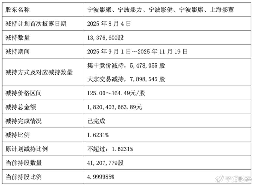 公告显示,公司五大员工持股平台宁波影聚、宁波影力、宁波影健、宁波影康及上海影董在9月至11月期间,通过集中竞价和大宗交易方式合计减持公司股份约1337万股,占总股本的0.83%,减持价格在125.0至164.49元区间,套现金额约18.2亿元。