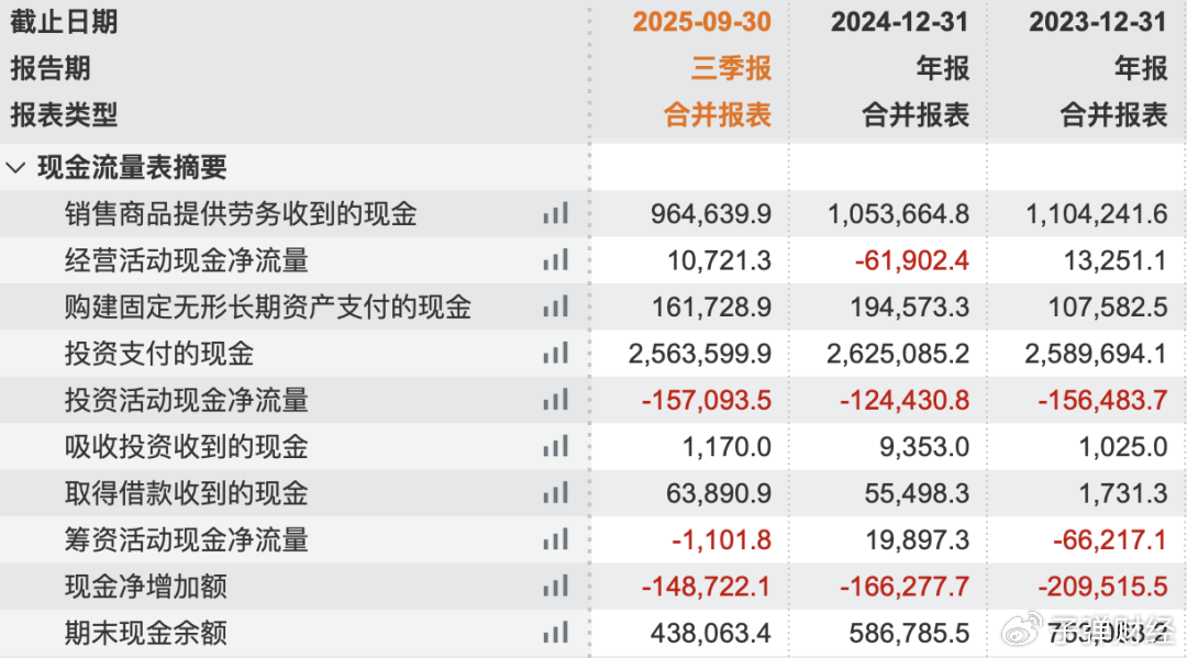 然而,公司经营活动现金流净额自2022年达到6.82亿元后一路下滑,2024年已转为净流出6.19亿元。今年前三季度虽恢复为正,仅1.07亿元,远低于同期利润水平。期末现金余额降至43.8亿元,比年初减少近15亿元。