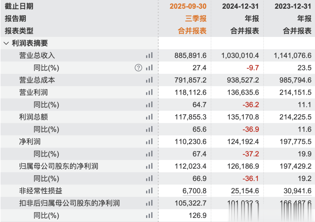 2025年前三季度,联影医疗的业绩出现明显恢复,表现最突出的是扣非后归母净利润10.53亿元,同比增长126.9%。