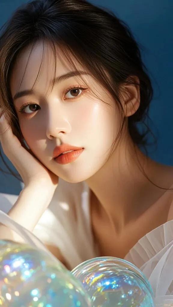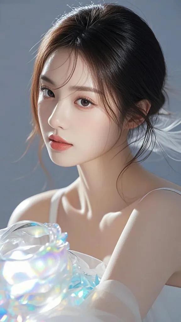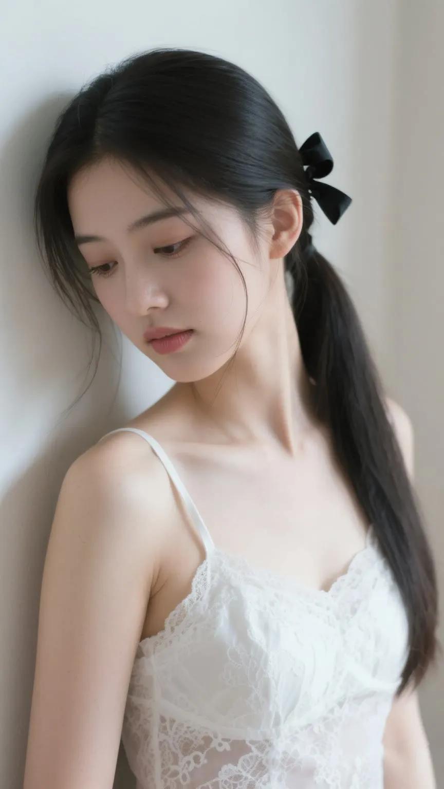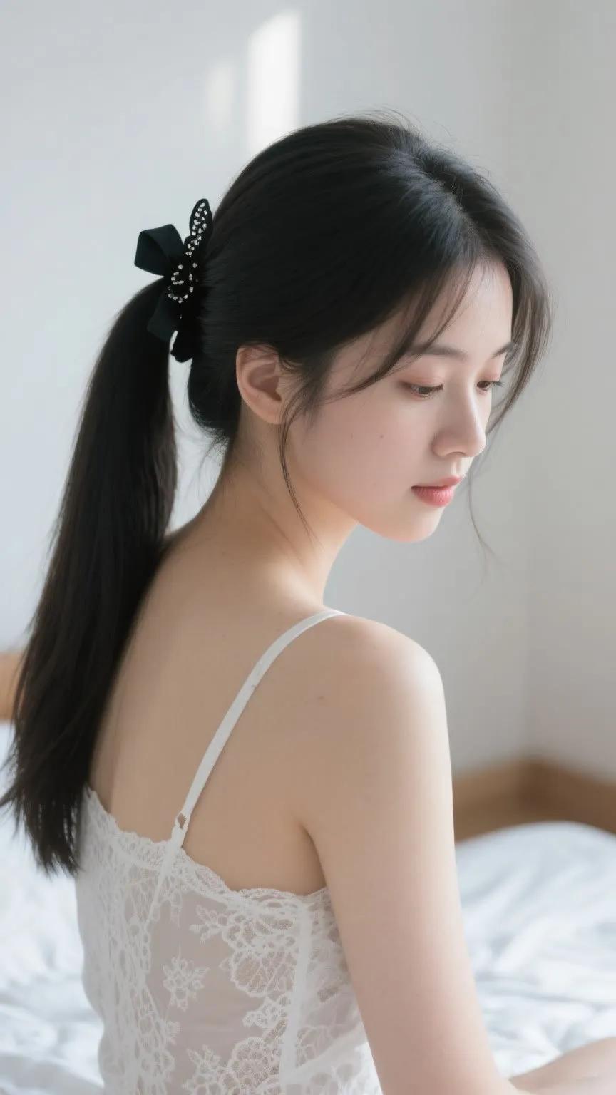 温柔少女,黑发蝴蝶结,白色蕾丝裙,清新自然。