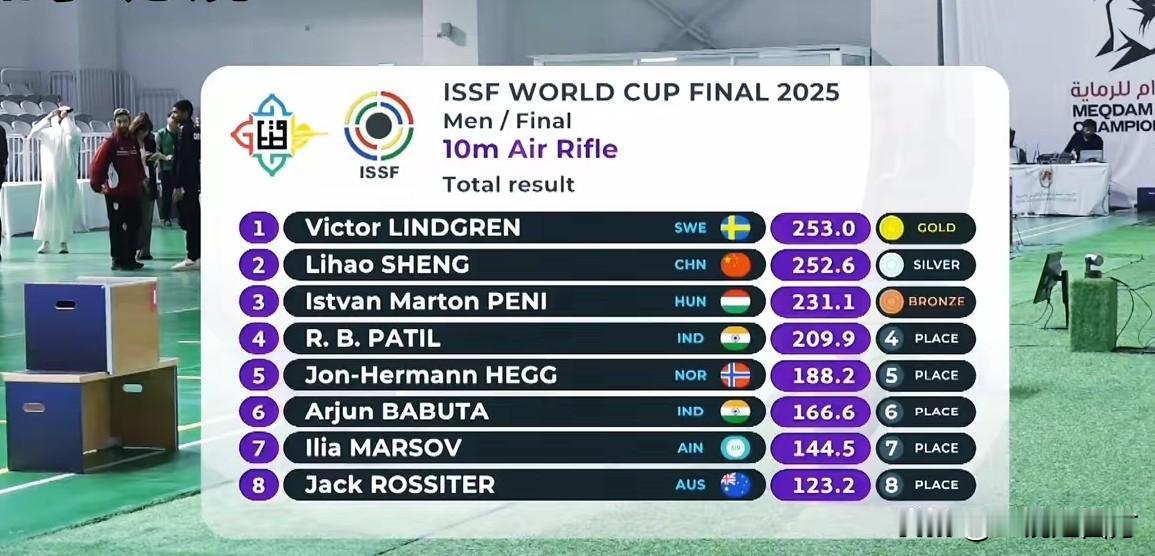 在卡塔尔进行的射击世界杯总决赛结束了男子10米气步枪决赛,资格赛排名第五晋级的奥运冠军盛李豪在决赛中开局发挥不佳,进入淘汰轮时仅名列第六位,但之后每一轮都进一个名次,最终进入与瑞典选手林德格伦的金牌对决轮,两人在最后一轮都展现了良好的状态,盛李豪由于之前轮次0.4环的差距,最终以252.6环屈居亚军。