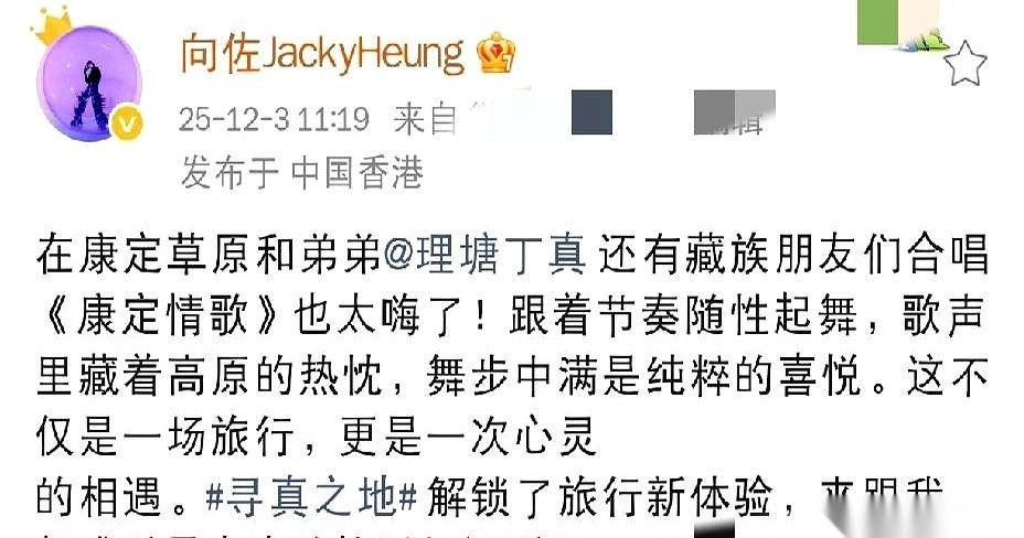 向佐,丁真,草原,篝火。 刷到这个视频的时候,我第一反应是,这俩人怎么玩到一块儿去了? 黑黢黢的夜里,火光映着脸。向佐那一身腱子肉,配上他那个有点笨拙但又无比投入的舞步……妈呀,那种快乐简直要从屏幕里溢出来了。 真的,看惯了明星们在镜头前三百六十度无死角的精致营业,突然看到这么一个“野生”的画面,还挺恍惚的。 那不是表演。 那是一种卸下了所有身份标签后的彻底放松。 在那一刻,他不是“向家的公子”,也不是银幕上的硬汉,他就是一个被《康定情歌》和朋友们的热情彻底点燃了的普通男人,一个在高原上找回了最简单快乐的灵魂。 那种快乐,是装不出来的。 他跳得好不好看,一点都不重要。重要的是,那股劲儿,那种“管他呢,老子今天就是要开心”的劲儿,太有感染力了。 我们这些天天在格子间里被KPI追着跑,连笑一下都要考虑场合的人,缺的不就是这个吗? 缺的就是这种可以让你暂时忘掉自己是谁,忘掉所有身份和角色,就只是跟着心跳、跟着篝火去笑、去闹的瞬间。 这种纯粹,真奢侈。
