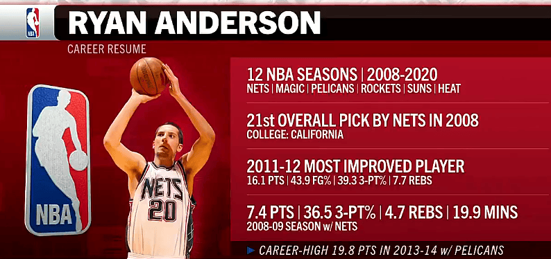 比赛的第三节,转播画面给出一组信息,内容为在鹈鹕和篮网都征战过的前NBA球员莱恩-安德森的生涯概况回顾,详情如下: