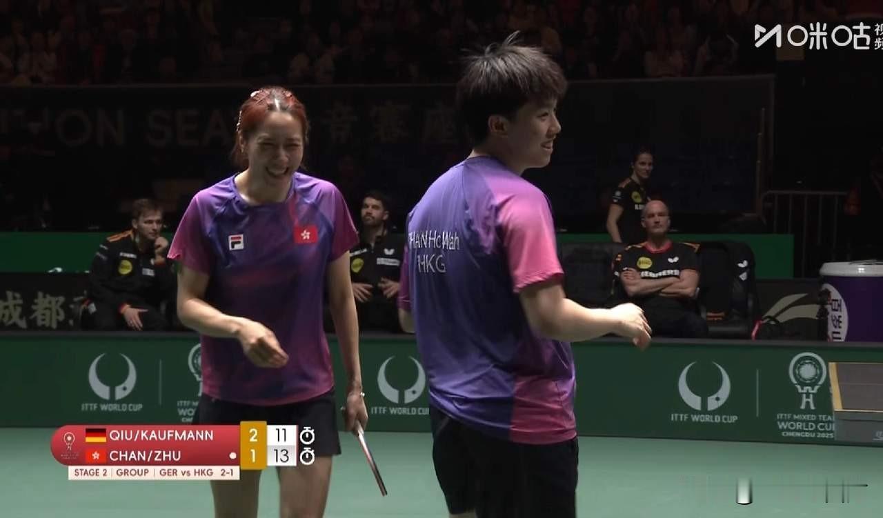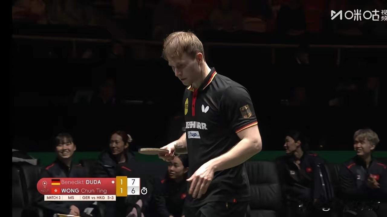 国际乒联混合团体世界杯第二阶段循环赛最后结束的一场比赛,已经锁定第三名晋级半决赛的德国队对阵已经无缘出线的中国香港队,首盘混双,邱党/考夫曼2-1战胜陈灏桦/朱成竹,第二盘女单,温特2-1战胜杜凯琹,第三盘男单,黄镇廷2-1击败杜达,第四盘男双,邱党/杜达2-1逆转战胜黄镇廷/陈颢桦,为队伍拿到赛点,第五盘女双,温特/考夫曼11-8击败杜凯琹/朱成竹,帮助队伍8-5锁定胜利,将与中国队争夺决赛权。