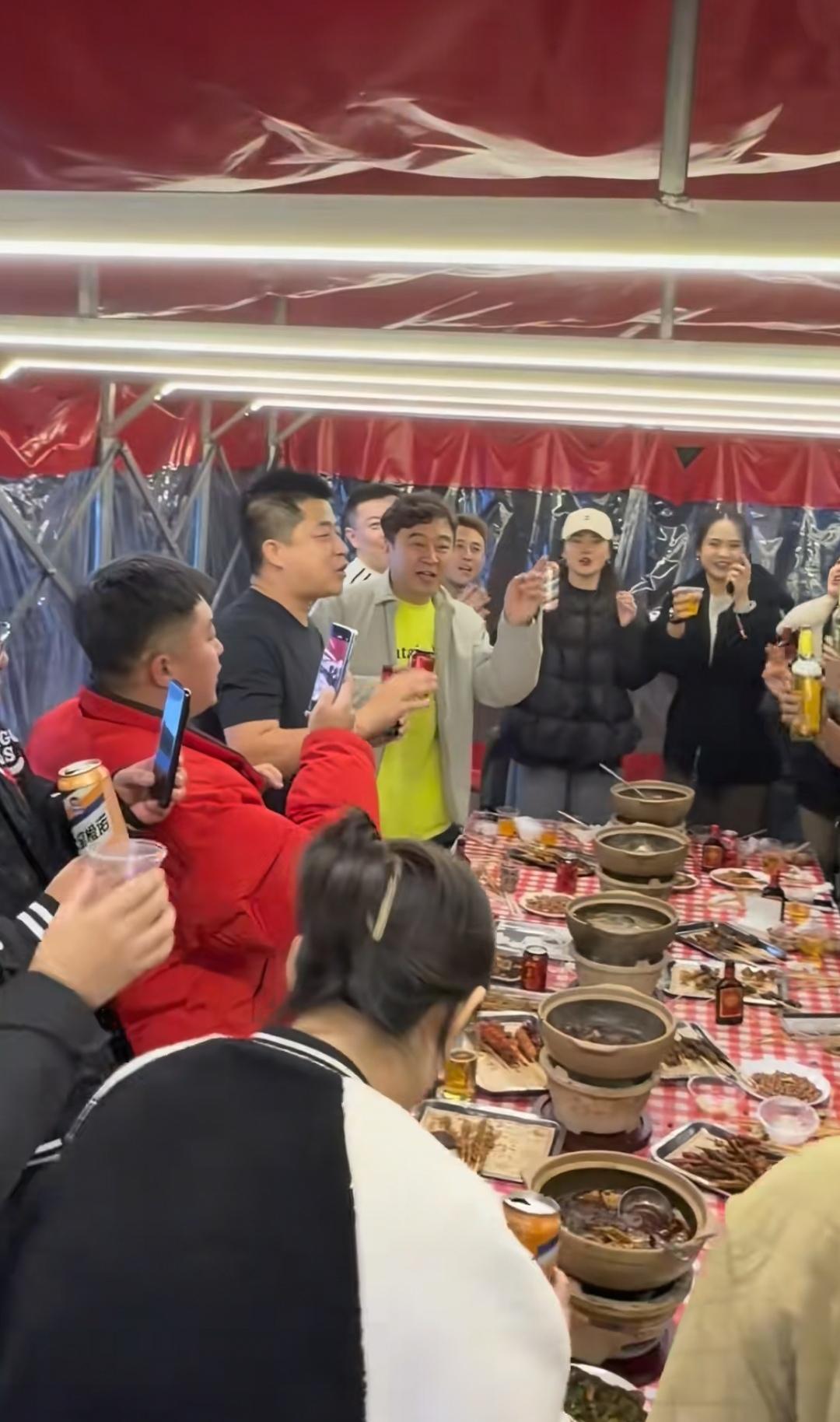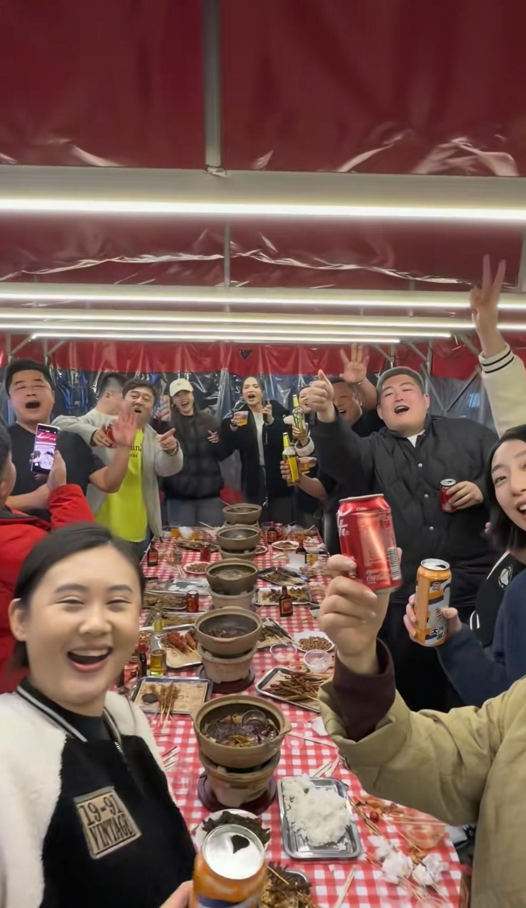 12月6日晚上,宋晓峰夫妻俩、赵大牛以及台前幕后的工作人员小聚,庆祝合肥巡演季圆满成功。 相聚地点很简易,不在大饭店,而是在户外搭建的简易帐篷里,大家围坐在小饭桌上,吃的是烧烤和小火锅,举杯唱着歌,氛围好欢乐。 作为二人转演员,演出完了小聚乐呵一下,是对生活最好的褒奖。