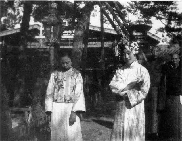 这张照片定格了逊清皇后婉容与淑妃文秀在紫禁城的日常瞬间,身后是宫苑里的古树,朱色建筑的檐角隐在树影后,是紫禁城独有的皇家规制氛围。 画面右侧的婉容身着带细条纹的精致长衫,头饰缀着装饰花钿,姿态舒展地交叠手臂,装扮里透着皇后身份的矜贵;左侧的文秀则垂首低眉,衣着虽是绣纹长衫配素色裙装,神态却带着几分拘谨与局促。 此时已是民国初年,她们虽仍居于紫禁城、保有逊清皇室的名义,但“皇后”“淑妃”的头衔早已脱离实际皇权——这场看似规整的宫内相处,实则是旧时代贵族在时代夹缝里的身份困局。