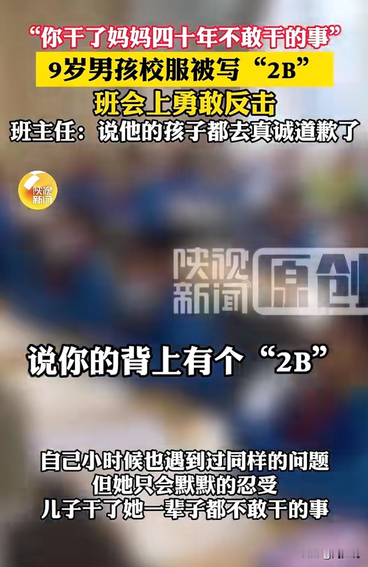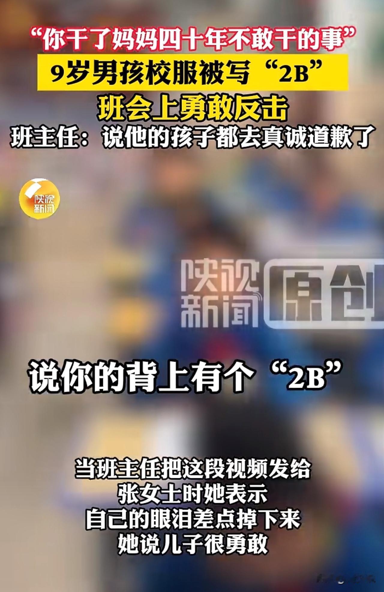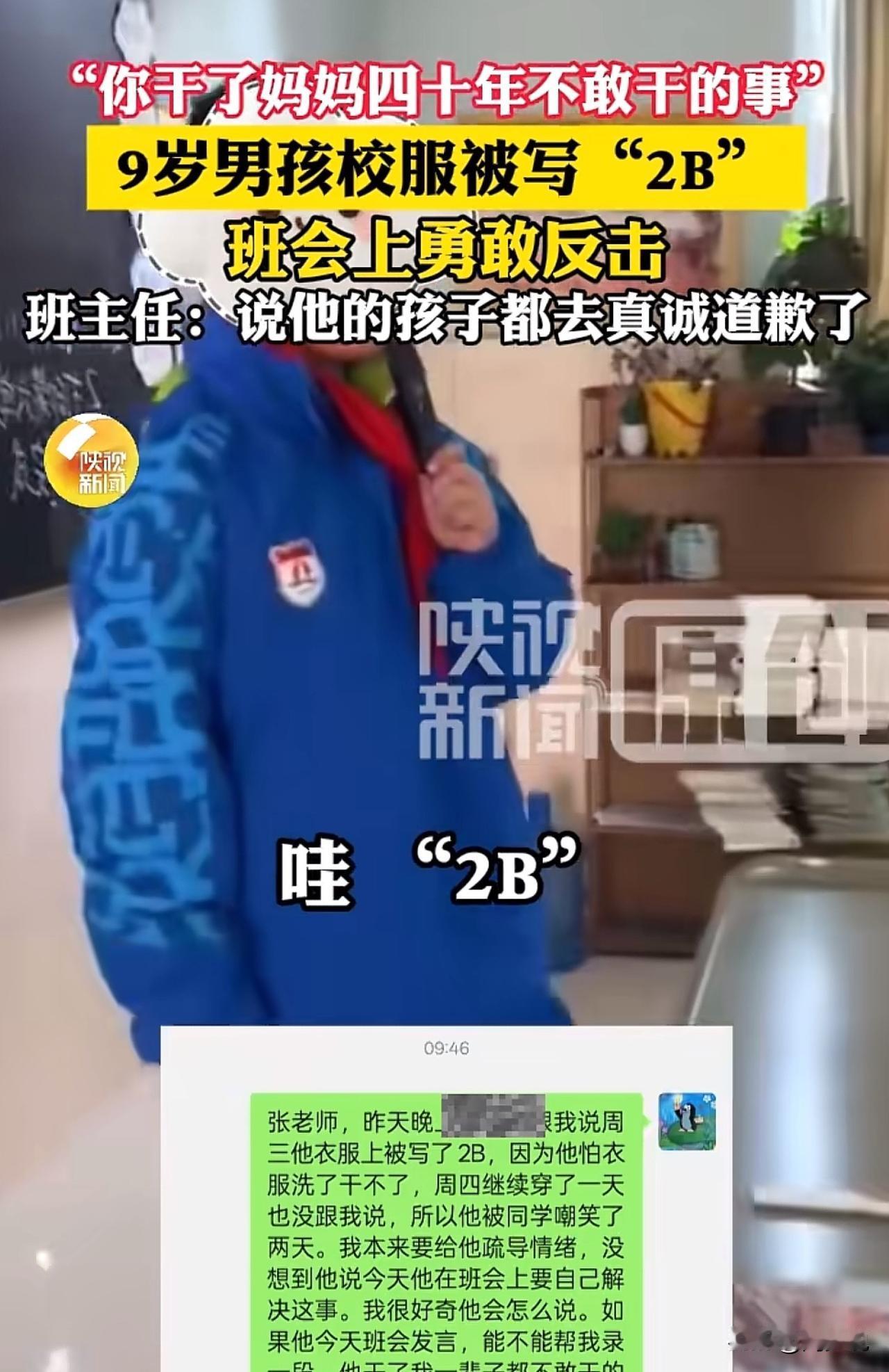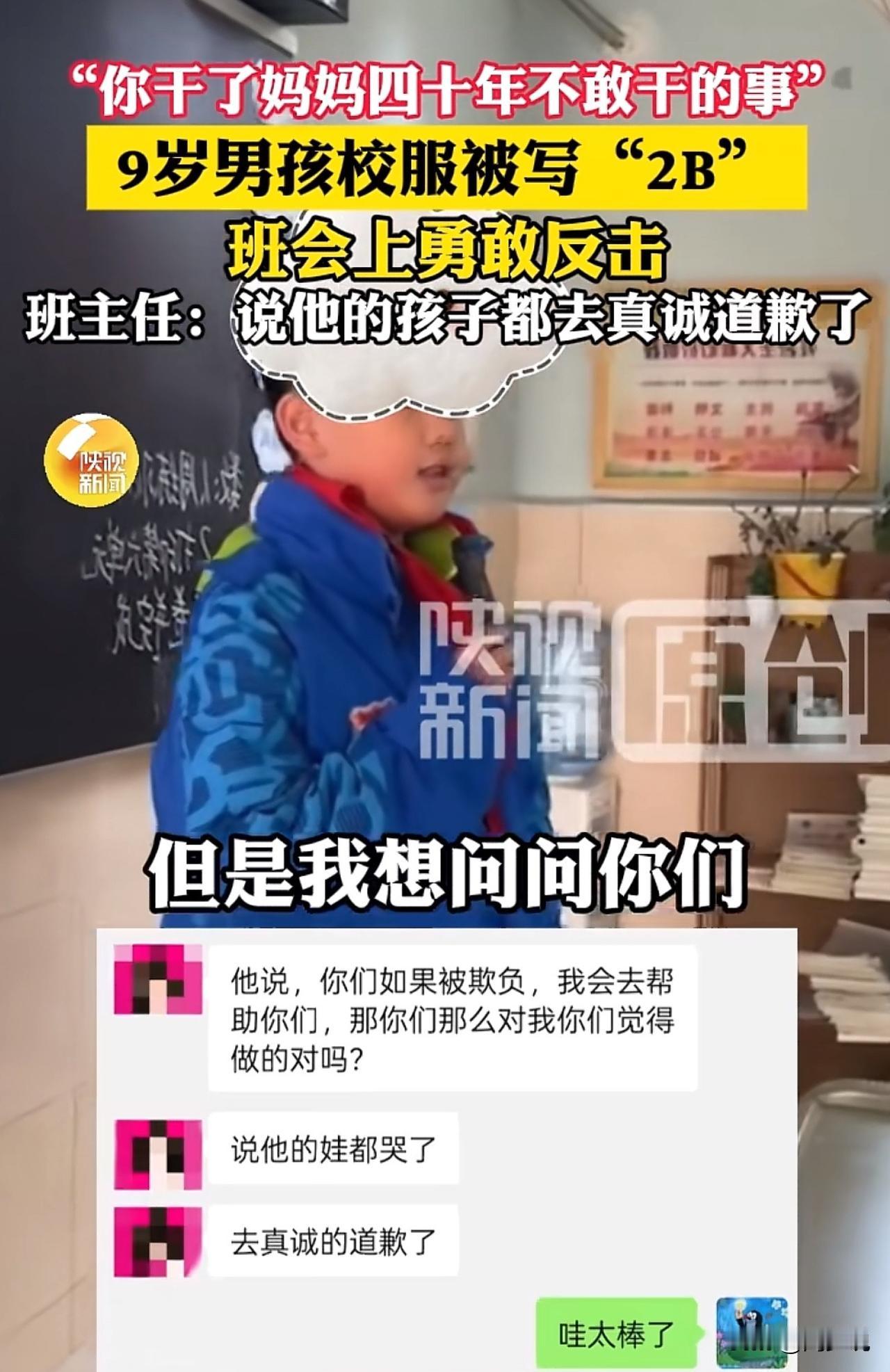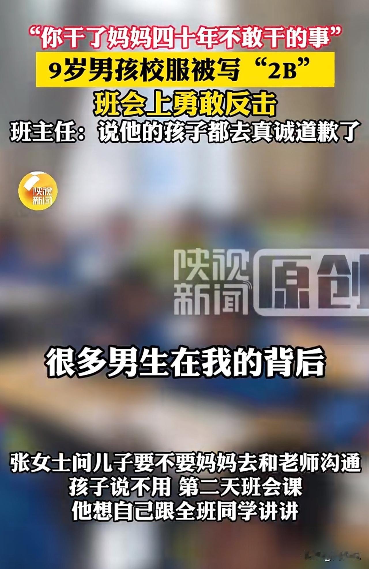 #男孩校服被写不雅文字班会勇敢反击#西安9岁男孩校服被写脏话,隐忍两天后班会勇敢发声,网友:太敢了! 近日,陕西西安9岁男孩校服被同学写不雅文字,遭众人起哄嘲笑,他隐忍两天后,竟在班会上主动发声维权。 据男孩母亲透露,周三早上孩子发现校服背被写脏话,全天遭同学起哄追赶,因怕校服洗了干不了,他没敢告知家长,周四穿校服上学又被嘲笑一天。直到周四晚,孩子才跟母亲倾诉心事,拒绝家长出面沟通,坚持要自己在班会解决。 次日班会,男孩有理有据说明情况,此前嘲笑他的同学纷纷真诚道歉,老师拍下视频发给家长,母亲直言孩子做了自己四十年不敢做的事,满心骄傲。 此事引发网友热议,有网友说:“这孩子太勇敢了,遇事不懦弱,还懂理性解决,比很多成年人都厉害!” 也有网友说,“敢直面委屈不隐忍,三观超正,值得点赞!” 更还有网友说:“同学道歉超真诚,孩子的处理方式太圈粉了。” 周少认为,9岁男孩面对欺负不逃避、不怯懦,主动理性维权,尽显勇气与担当。他不依赖家长,靠自己解决困境,这份清醒与果敢难能可贵。 孩子间的真诚道歉也满是善意,这份直面问题的态度,值得每个孩子学习,更让人看到成长里最珍贵的模样。#寻美三湘# #长沙新朋友#