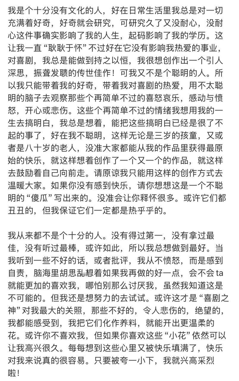 酷酷的滕写给观众的信喜人奇妙夜 比赛结束有温度!酷酷的滕发长微博致观众,聊作品、说自己,字里行间全是对生活的热爱,也让大家懂了创作的初心。