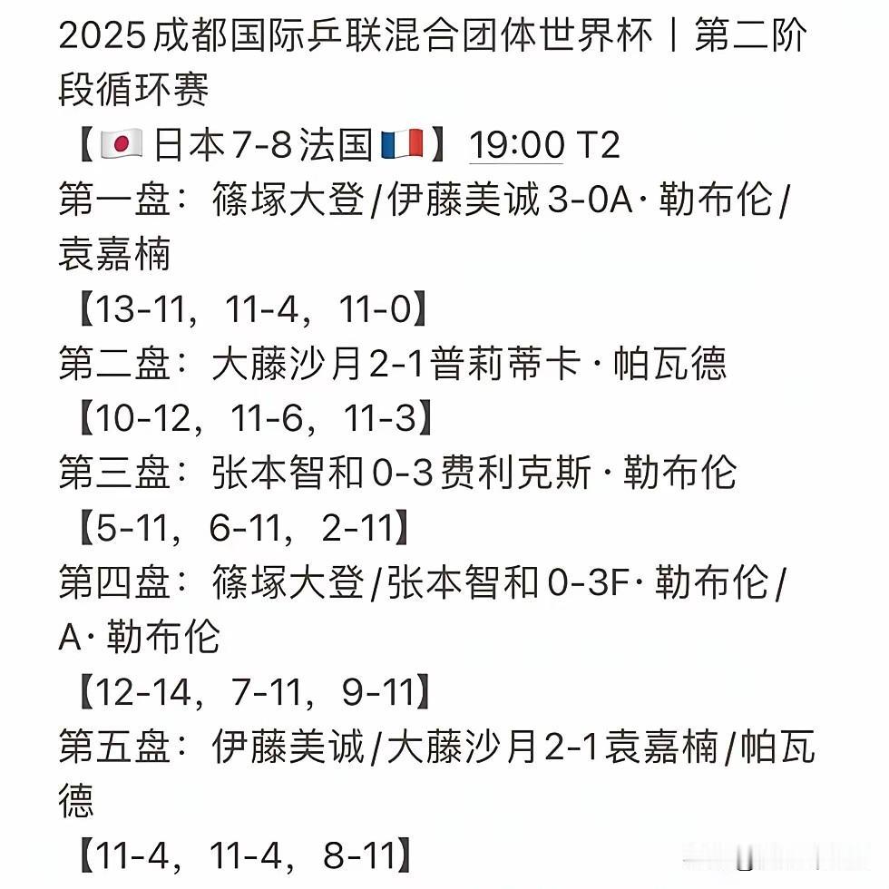 张本智和被打服,单打双打1分未得。 12月6日的中法大战,日本队从第三盘男单开始,被法国队打得找不着北。 先是张本智和0:3被小勒布伦狂虐,三局1分未得,小分也只得了13分(5-11,6-11,2-11)。 这还没完,紧接着的男双比拼,张本智和搭档篠塚大登又被勒布伦兄弟0:3(12-14,7-11,9-11)险胜,同样三局1分未得。 最终日本队7:8收获混团世界杯第二败,幸好前期成绩不错,不影响日本队进入第三阶段的四强赛,否则,张本智和回日本的日子不会好过滴!