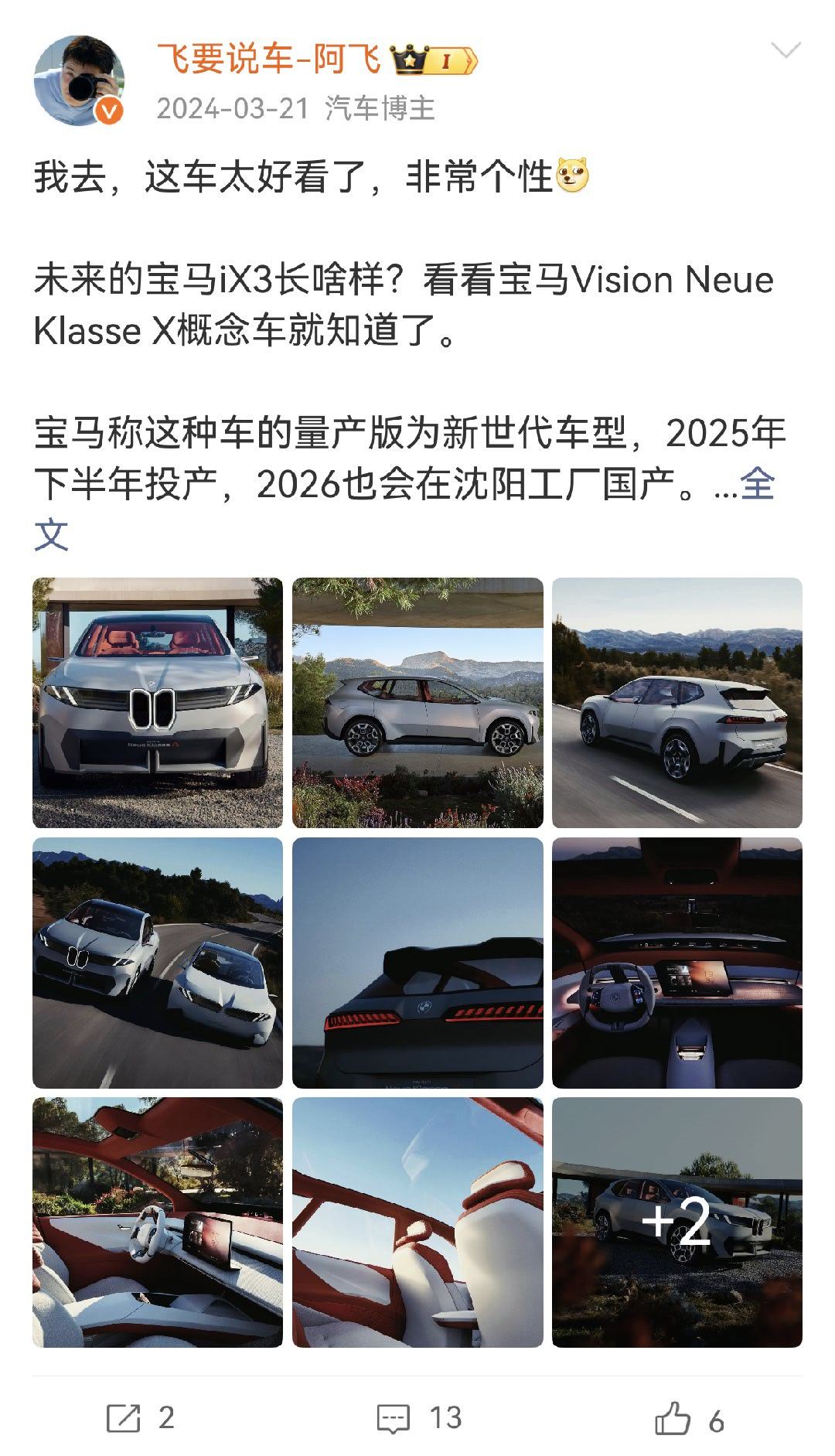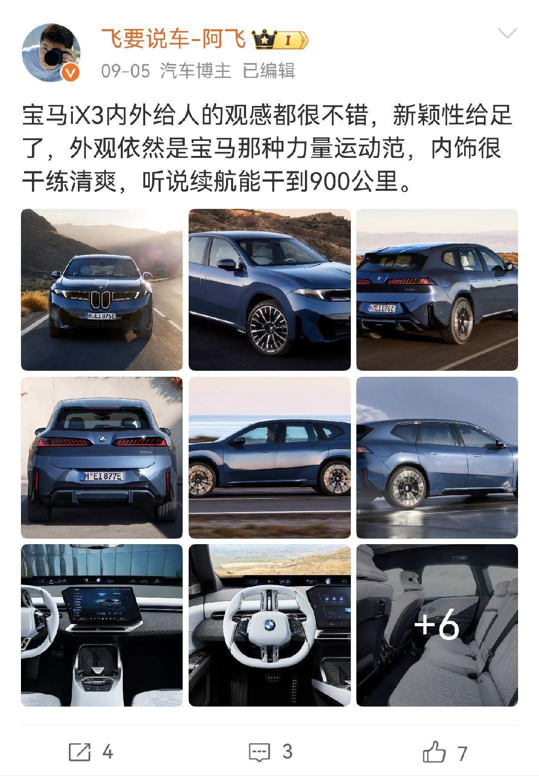 从概念车到量产车,我对全新宝马iX3的内外设计都非常有好感。看到这几天到海外试驾到这车的媒体老师说,全新iX3的驾驶质感极好,既让人好奇,但我也不意外,因为之前开i5就觉得底盘很扎实,很给力。宝马的操控,不用质疑。更炸裂的是,全新iX3的WLTC续航真有900公里!国内宣传续航的时候,普遍都用NEDC标准,普通消费者别信这个标准,根本不准。要信WLTC标准,这个标准很准。全新耳目一新的内外饰设计,顶级驾驶质感,超长纯电续航,还有国产后本土化的智能配置,只要价格不离谱,iX3有好戏看了。可惜,我已经买车了