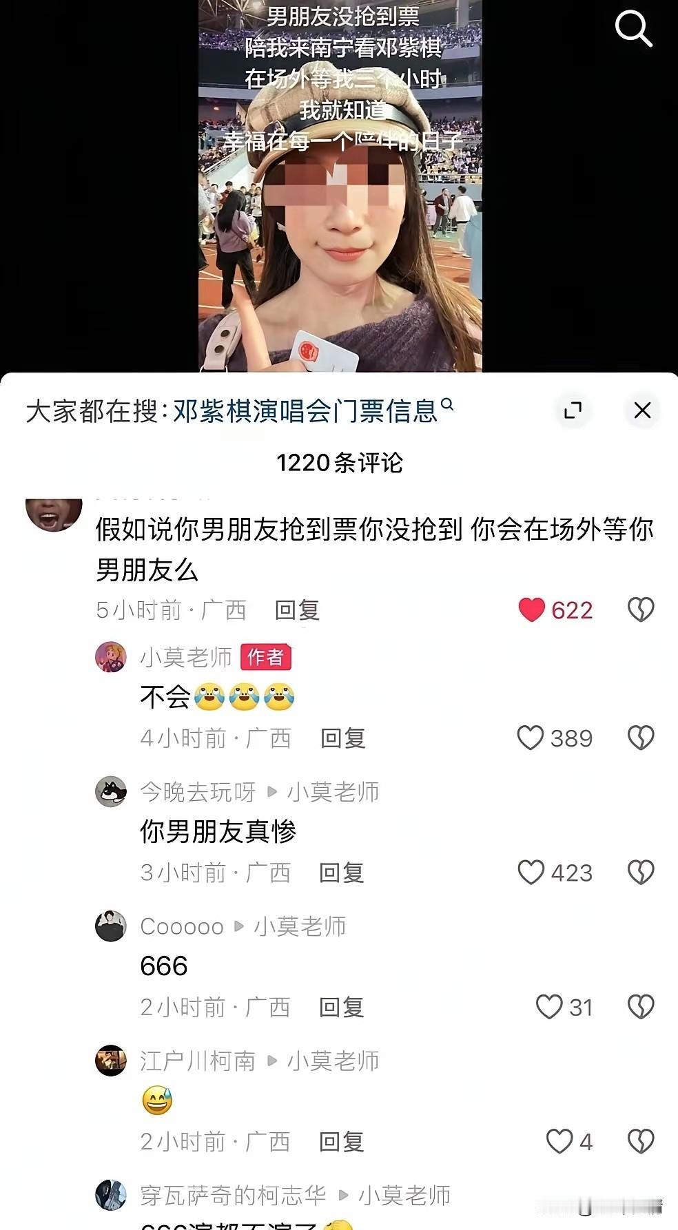 小莫老师在网上炫耀, 男朋友陪她到南宁看邓紫棋, 结果男朋友没有抢到票, 她开心的进场看了演唱会, 然后还发视频炫耀, 男朋友在场外等了他三个小时, 她表示幸福在每一个陪伴的日子里, 这话说的满满的鸡汤味道, 网友评论如果是你没有抢到票, 你会在场外等你男朋友三个小时吗, 小莫老师居然表示不会, 这就是男生和女生对于爱情的不同, 认真对待爱情的男生是很负责任的, 他可以为女生做很多事情, 这就叫深爱, 而女生则是只顾自己, 一旦对自己不利, 就会立马撤退, 这样的女生还值得深情的男生吗? 显然双方对于爱情的付出是不同的, 对于极度自私的女性, 男生也不必认真对待, 毕竟对方只顾自己, 小莫老师的男友是真的惨! 大家对于这样的爱情怎么看? 一起聊聊爱情 爱情究竟是什么样子的 关于爱情,你见过最伤感的一句话是什么 邓紫棋门票 邓紫棋北京唱会