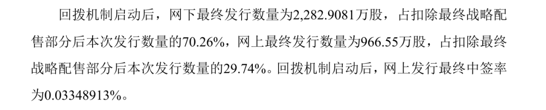 回拨机制启动后,网下最终发行数量为2282.91万股,占扣除最终战略配售部分后本次发行数量的70.26%,网上最终发行数量为966.55万股,占扣除最终战略配售部分后本次发行数量的29.74%。回拨机制启动后,网上发行最终中签率为0.03348913%。