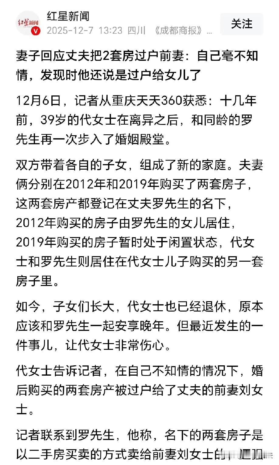 重庆,离异男子和离异女子共同组建新的家庭,十几年的婚姻生活里,两人先后购买了两套房产,全部登记在丈夫名下。女子本以为有这两套房产就可以安享晚年,可谁知,男子竟然悄悄把这两套房过户到前妻名下。女子质问他:你住着我的房子,还把我们共同财产赠给前妻,这简直是晴天霹雳。男子反驳道:我俩经济独立,这两套房是按二手房卖给前妻的,没毛病! 代女士今年五十出头,退休后本想着能和相伴十几年的丈夫罗先生安稳度日,可一桩突如其来的事,彻底打碎了她的晚年期许。 十几年前,39岁的代女士刚经历离异,带着对安稳生活的向往,和同龄、同样离异的罗先生走到了一起,两人带着各自的子女组建了新家庭。 有了第一次失败的婚姻,这一次她格外珍惜,她掏心掏肺的对罗先生,只希望能够携手白头,共度余生。 那时候,罗先生在外租房住,代女士刚好有套三室两厅的房子,她就让罗先生搬到这里,两人一起生活,还能省个租房的费用。 婚后的日子过得不算轰轰烈烈,却也平稳踏实,代女士一门心思经营着这个家,总觉得日子会慢慢越来越好,晚年有依靠。 2012年和2019年,夫妻俩先后置办了两套房产,虽说房产证上都只写了罗先生的名字,但代女士没多想,只当是夫妻共同的家底。 代女士想着,有这两套房子在,往后养老就没了后顾之忧,她的心里一直透着踏实。 两套房子里,2012年买的那套,让罗先生的女儿住着,2019年买的则暂时空着,她和罗先生平时住的,还是自己儿子买的那套房子。 日子就这么不慌不忙地过着,子女们渐渐长大成人,代女士也顺利退休,满心盼着能和罗先生安享晚年。 可她万万没料到,自己没等来安稳晚年,却等来了一个晴天霹雳。 不久前,代女士意外得知,那两套婚后买的房产,竟然在她毫不知情的情况下,全被罗先生过户给了他的前妻刘女士。 得知消息的那一刻,代女士脑子一片空白,她实在想不通,一起过了十几年的夫妻,丈夫怎么能背着自己做出这种事。 丈夫罗先生明明住着她儿子买的房子,还偷偷把两人的共同财产转给前妻,这份背叛让代女士实在难以接受。 带着满心的质问,代女士找到罗先生讨要说法,可罗先生的回应却格外冷漠,没有半分愧疚。 罗先生直言,这两套房子是按二手房买卖的方式卖给前妻的,没什么不妥。 不仅如此,他还特意强调,就算他和代女士是夫妻,两人一直都是经济独立的,自己处置房子合情合理。 罗先生的话像一盆冷水,浇透了代女士的心,十几年的夫妻情分,在两套房产面前仿佛变得一文不值,她满心的晚年期许落了空,只剩下满心的失望与寒心。 从法律角度来看,这两套房产大概率属于夫妻共同财产。 《民法典》第一千零六十二条规定:夫妻在婚姻关系存续期间所得的下列财产,为夫妻的共同财产,归夫妻共同所有: (一)工资、奖金、劳务报酬;(二)生产、经营、投资的收益;(三)知识产权的收益;(四)继承或者受赠的财产,但是本法第一千零六十三条第三项规定的除外;(五)其他应当归共同所有的财产。夫妻对共同财产,有平等的处理权。 本案中,两套房产均购置于代女士与罗先生婚姻存续期间,虽然登记在罗先生个人名下,且罗先生主张双方经济独立,但如果没有书面财产约定的证据,很难得到法院的支持。 我国法定夫妻财产制为婚后所得共同制,若无明确书面约定划分财产归属,即便双方收入各自支配,婚后共同购置的房产仍属于夫妻共同共有。 代女士对两套房产享有平等的所有权与处理权,罗先生无权单独认定房产为个人财产并自行处置。 那么,罗先生过户房产行为是否有效呢? 《最高人民法院关于适用〈中华人民共和国民法典〉婚姻家庭编的解释(二)》第七条规定: 夫妻一方为重婚、与他人同居以及其他违反夫妻忠实义务等目的,将夫妻共同财产赠与他人或者以明显不合理的价格处分夫妻共同财产,另一方主张该民事法律行为违背公序良俗无效的,人民法院应予支持。 罗先生在代女士不知情的情况下,将夫妻共同房产过户至前妻名下,即便声称是“二手房买卖”,仍涉嫌违反夫妻忠实义务、违背公序良俗。 从行为本质来看,前妻属于与罗先生有特殊过往关系的主体,罗先生擅自处分大额夫妻共同财产且未告知配偶,主观上存在损害代女士财产权益的故意,客观上违背了婚姻家庭伦理中的忠实义务与善良风俗。 因此,罗先生的过户行为应认定为无效,代女士有权向法院主张要求前妻返还两套房产,维护自身合法财产权益。